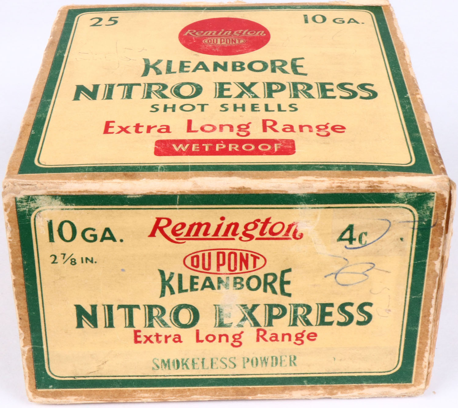Remington, Kleanbore, NITRO EXPRESS, 10ga., 1pc., Partial 24rds., shot size 4C, box is yellow, red and green, box is solid, has light soiling & light edge wear with very nice colors, shells are excellent. Grade: Excellent - Value: 20 to 80