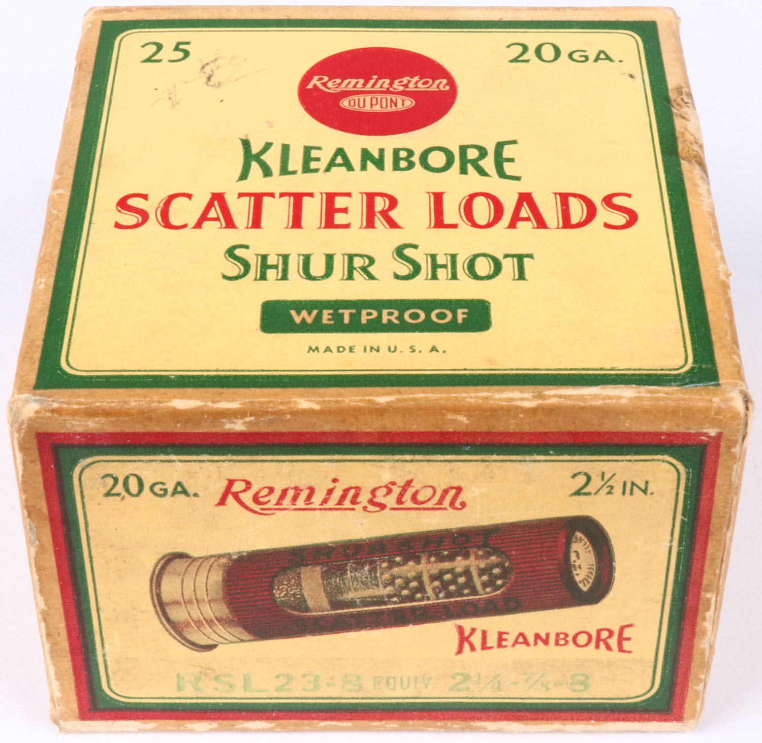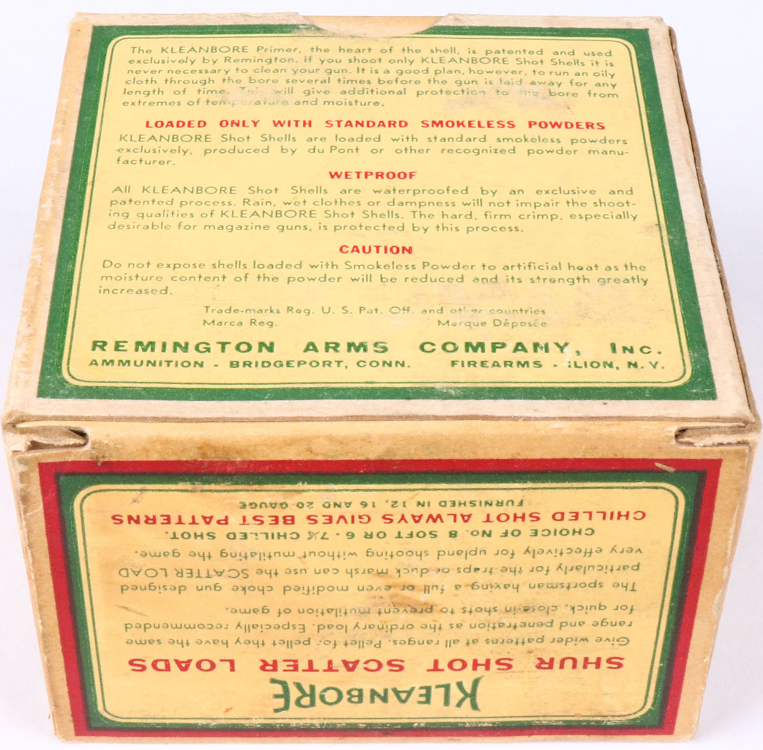 Remington, Kleanbore, SHUR SHOT, 20ga., 1pc., Full, shot size 8 Scatter Loads, box is yellow, red and green, box is solid, has light scuffing & light soiling with great colors, shells are excellent. Grade: Excellent - Value: 10 to 60