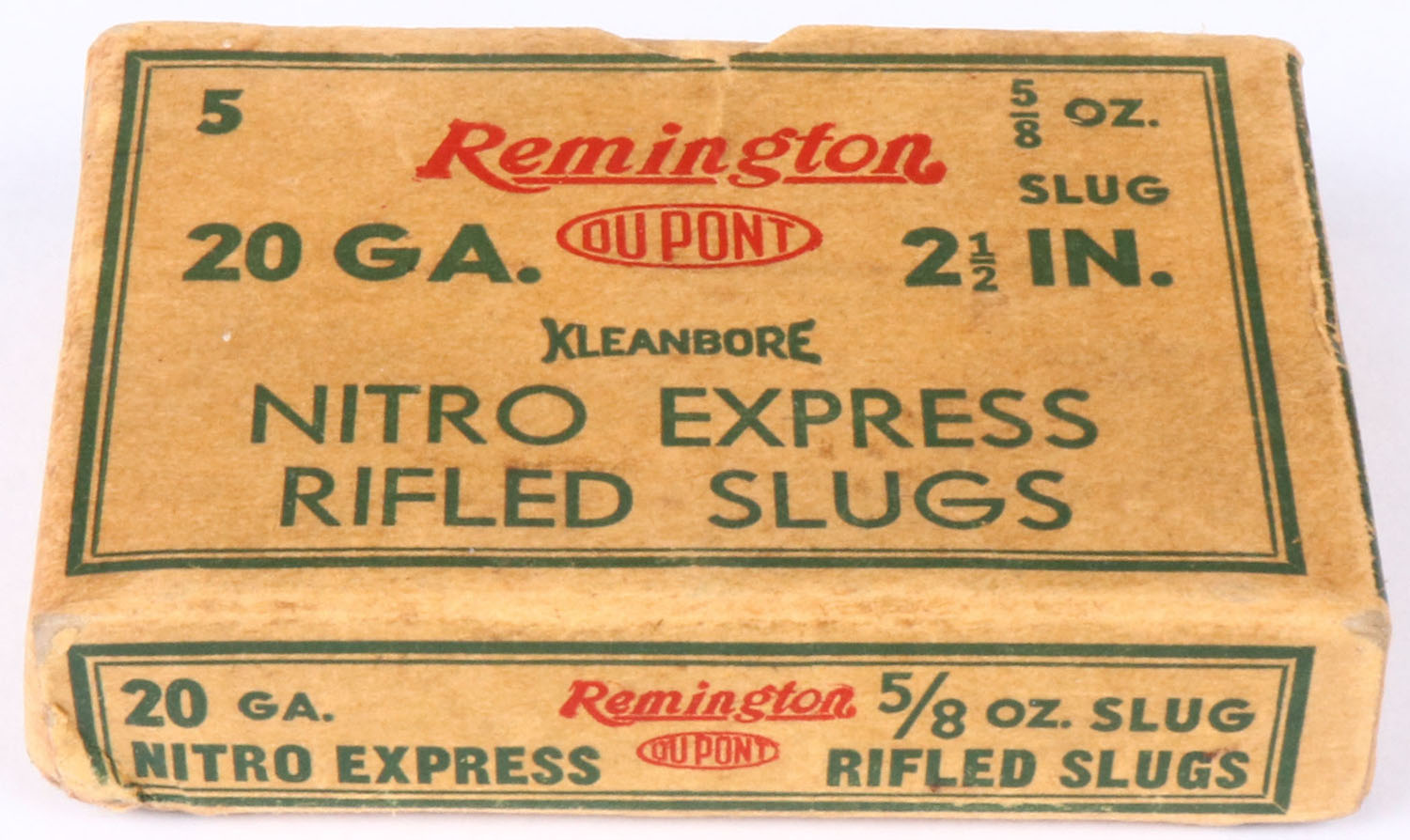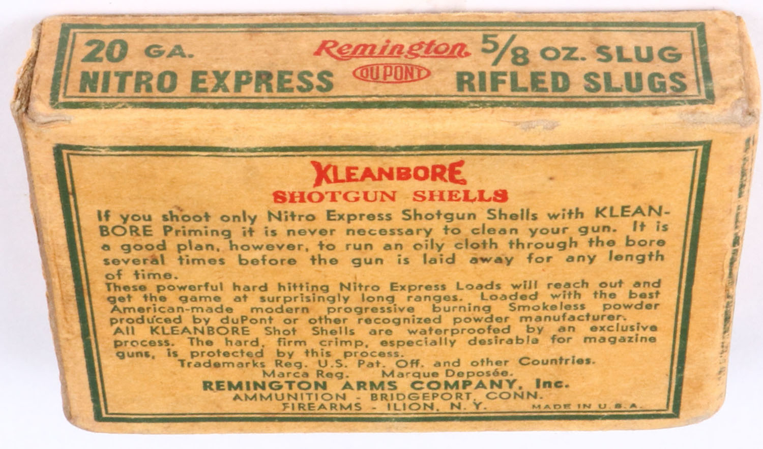 Remington, Kleanbore, NITRO EXPRESS, 20ga., 1pc., Full, shot size Rifled Slugs, box is yellow, red and green, box is solid, has light soiling, torn inside flap & missing inside flap with very nice colors, shells are excellent. Grade: Excellent - Value: 10 to 30