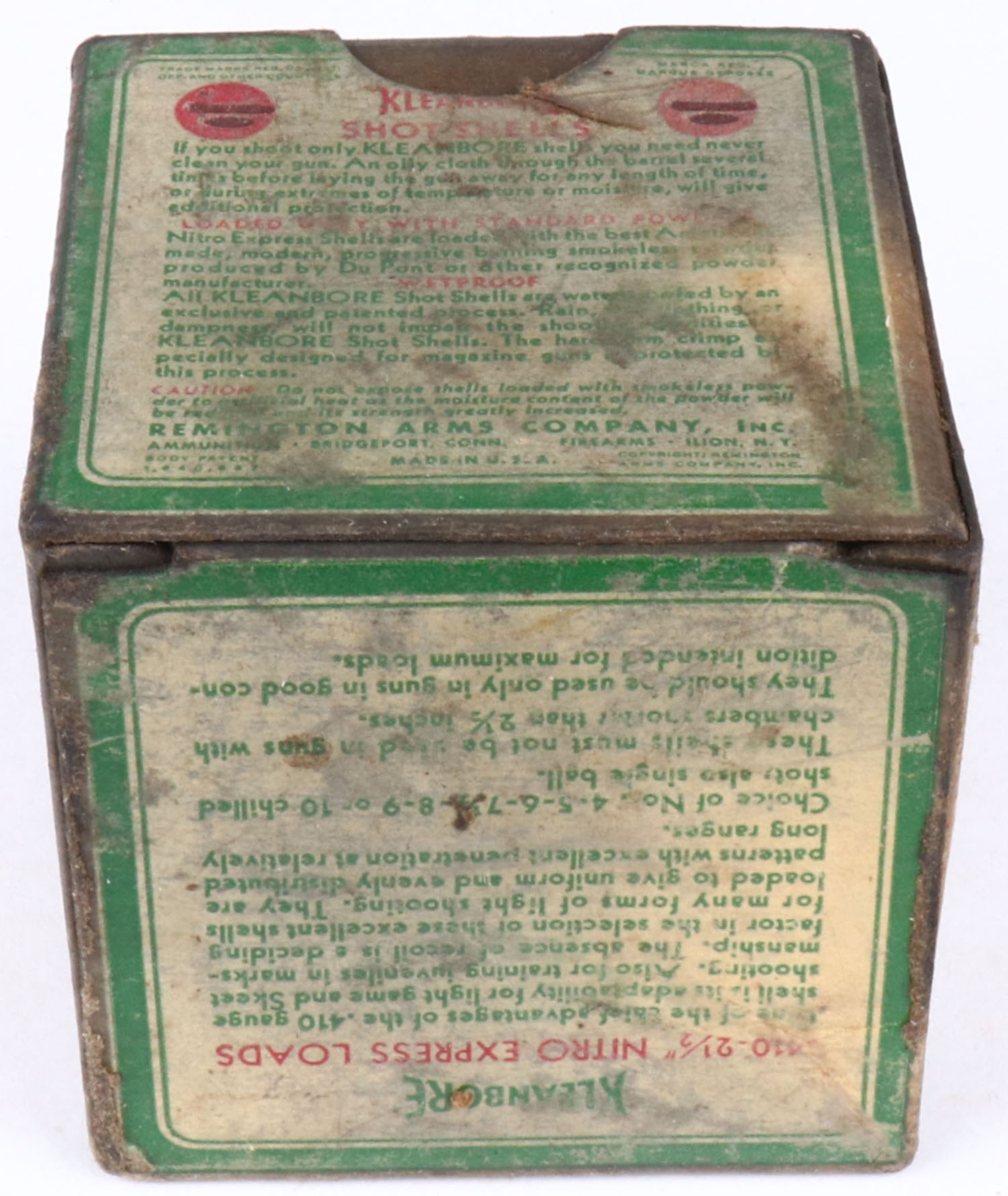 Remington, Kleanbore, NITRO EXPRESS, 410ga., 1pc., Empty, shot size 6C, 2 1/2'', box is yellow, red and green, box is solid, has soiling, edge wear & scuffing with fair colors. Grade: Good ++ - Value: 10 to 30