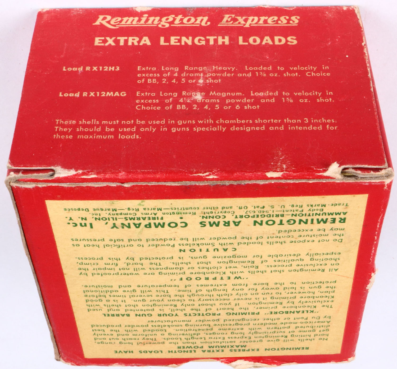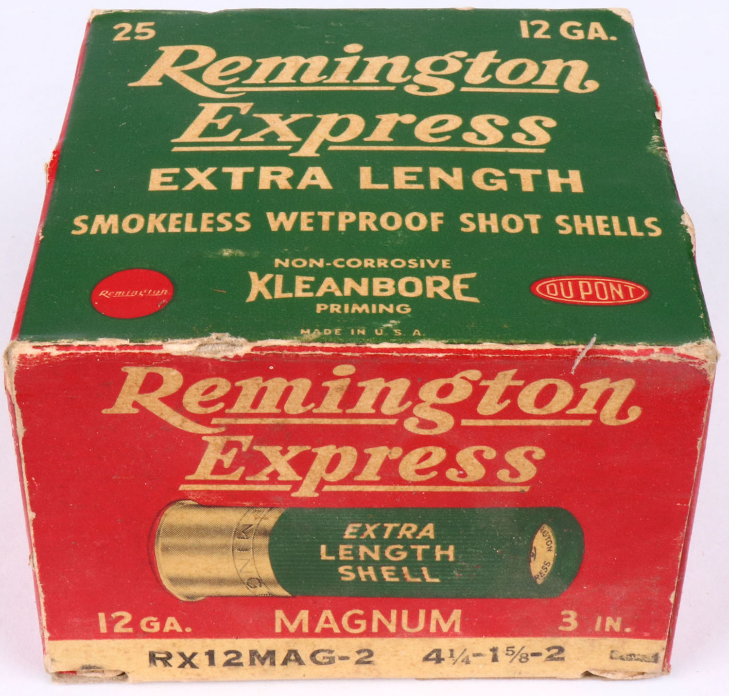 Remington, Kleanbore Express, 12ga., 1pc., Full, shot size 2 Magnum, red, white and green box, 3'', box is solid with small shell protrusions & light edge wear with great colors, shells are excellent. Grade: Excellent - Value: 10 to 30