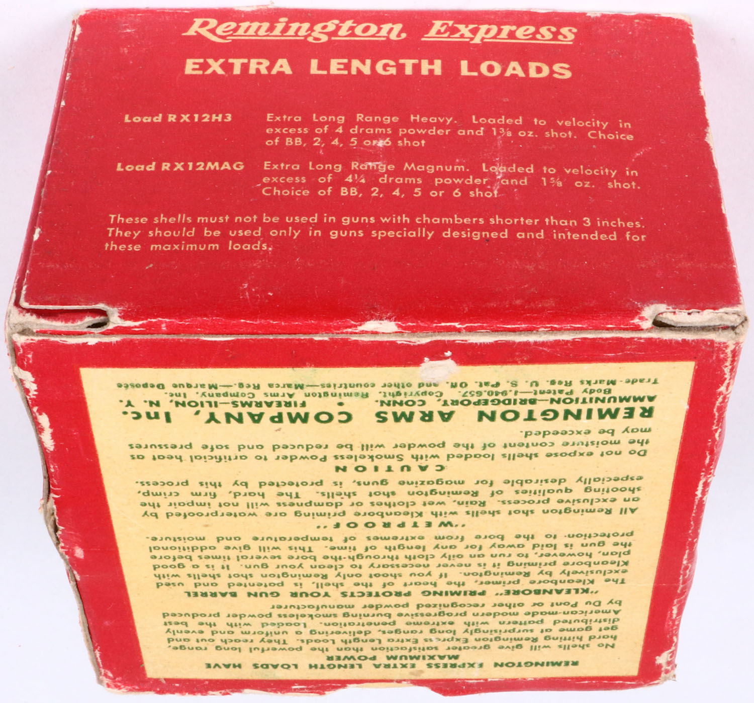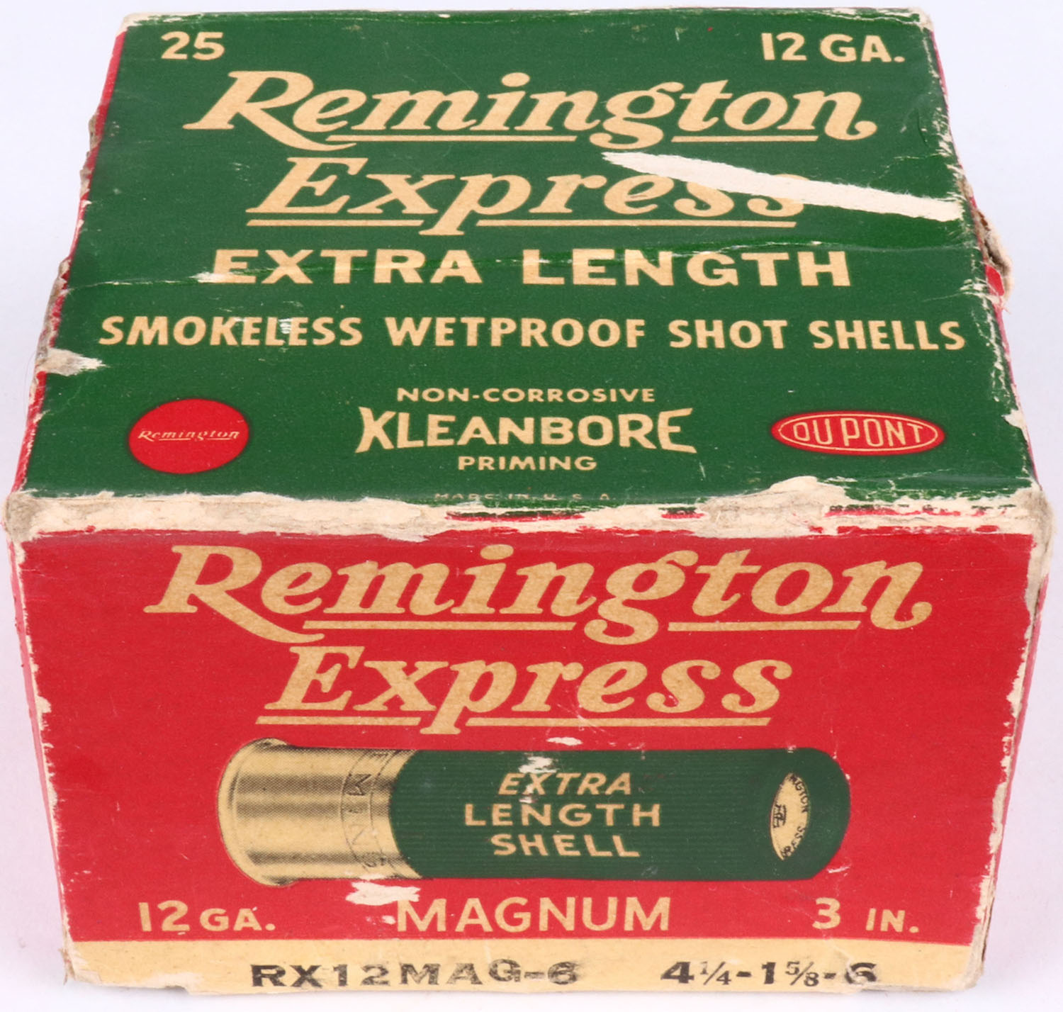 Remington, Kleanbore Express, 12ga., 1pc., Full, shot size 6 Magnum, red, white and green box, 3'', box has edge wear, shell protrusions, scuffing & soiling with very nice colors, shells are excellent. Grade: Very Good + - Value: 10 to 30