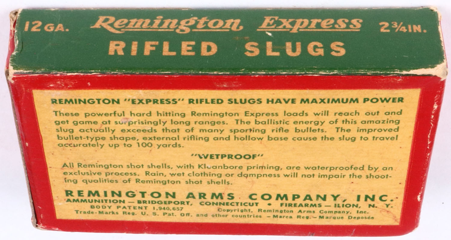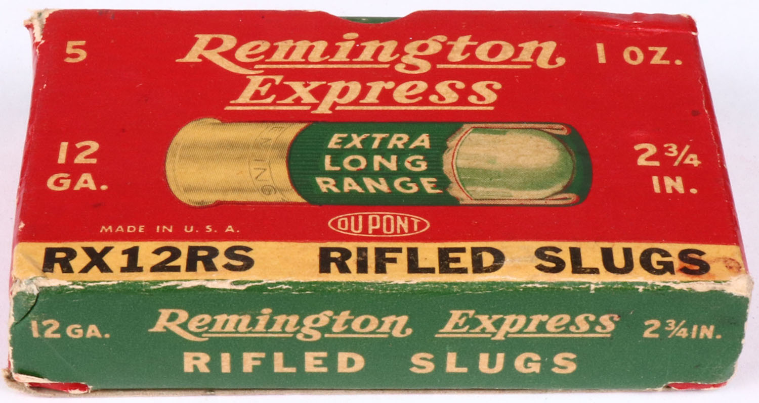 Remington, Kleanbore Express, 12ga., 1pc., Full, shot size Rifled Slugs, red, white and green box, 2 3/4'', box is solid with light edge wear & great colors, shells are excellent. Grade: Excellent - Value: 10 to 20