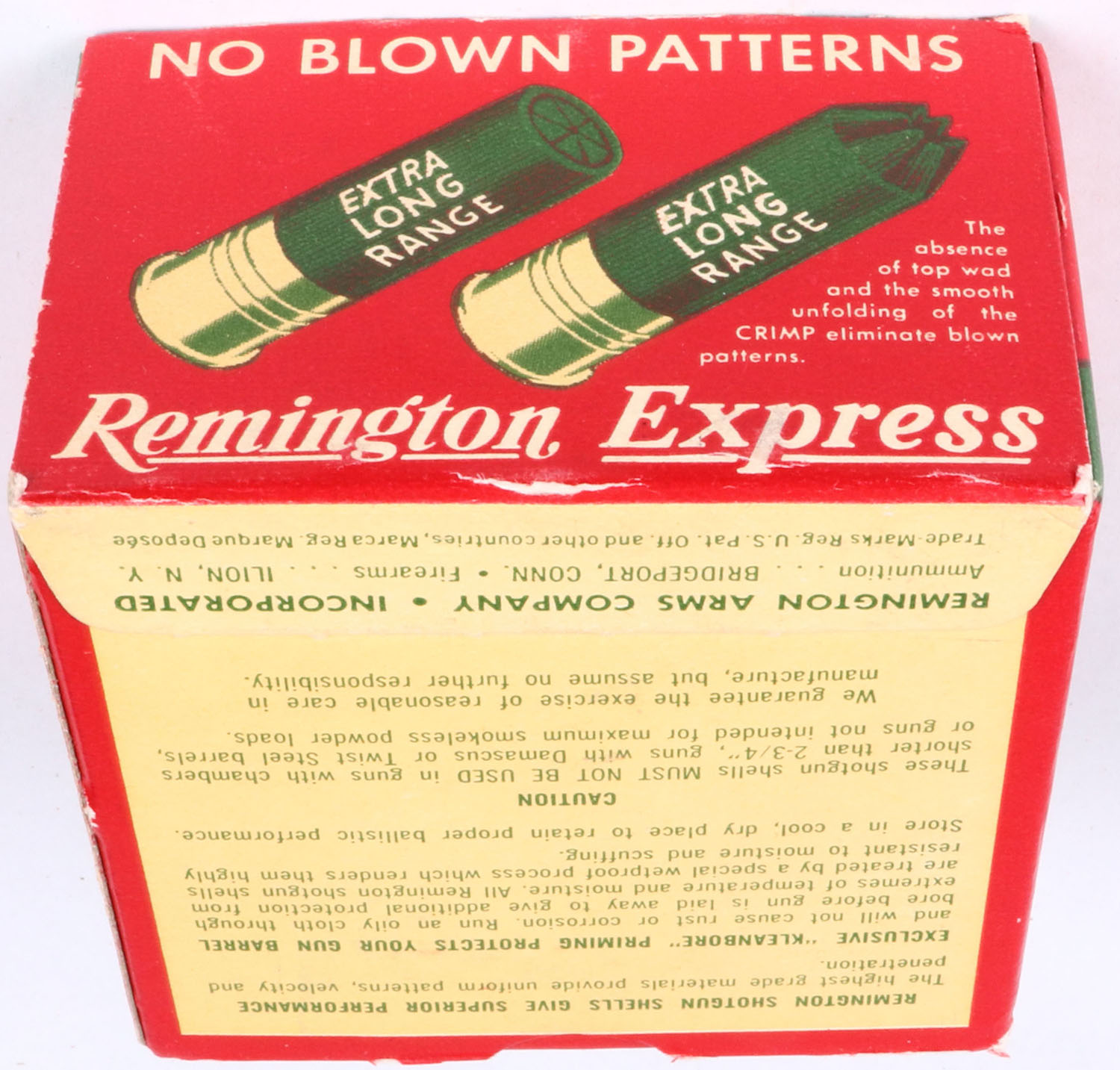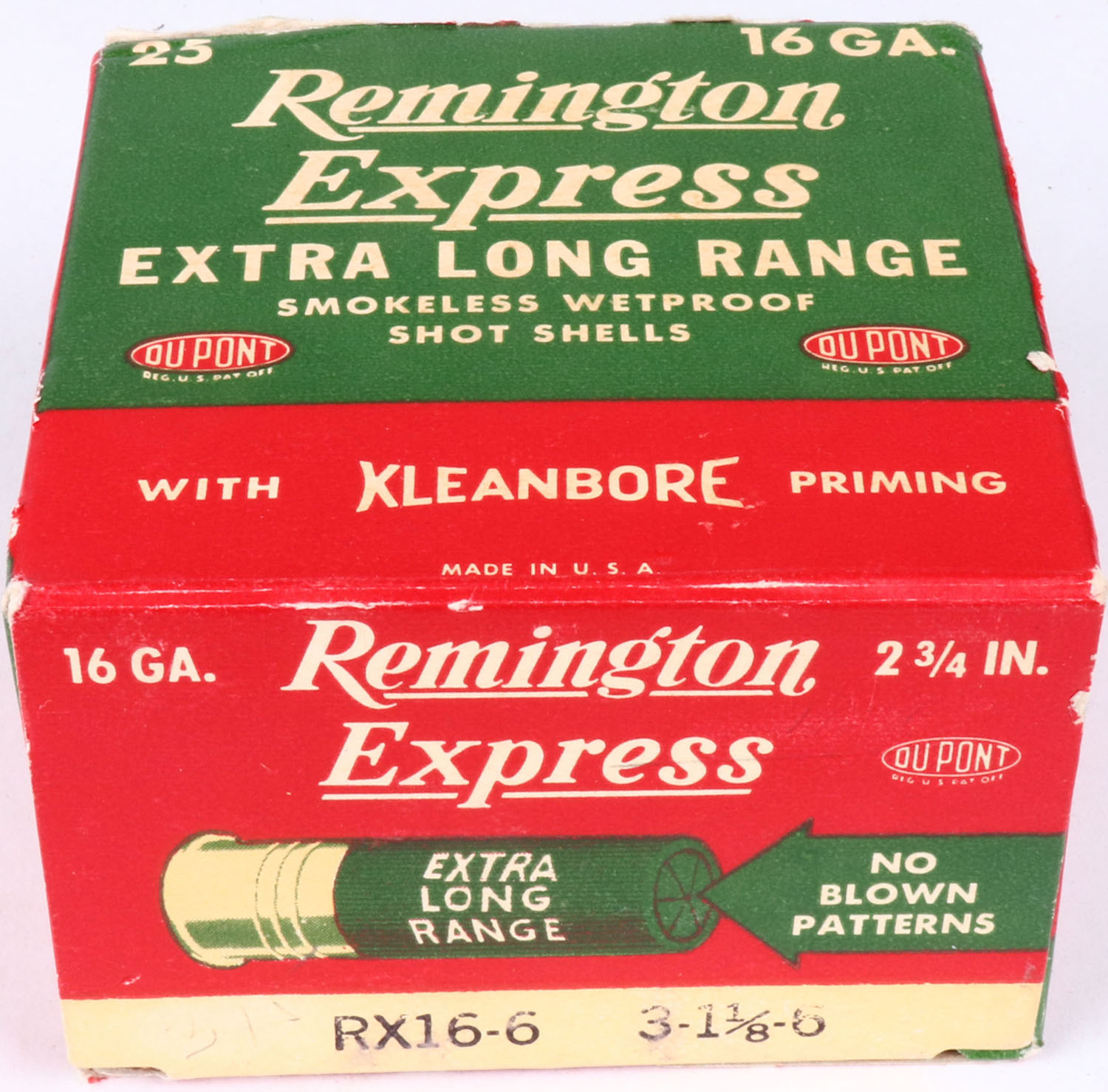 Remington, Express Kleanbore, 16ga., 2 3/4'', 1pc., Full, shot size 6, box is red, white and green, box is solid, box has bottom flap torn & light edge wear, with great colors, shells are excellent. Grade: Excellent - Value: 10 to 30