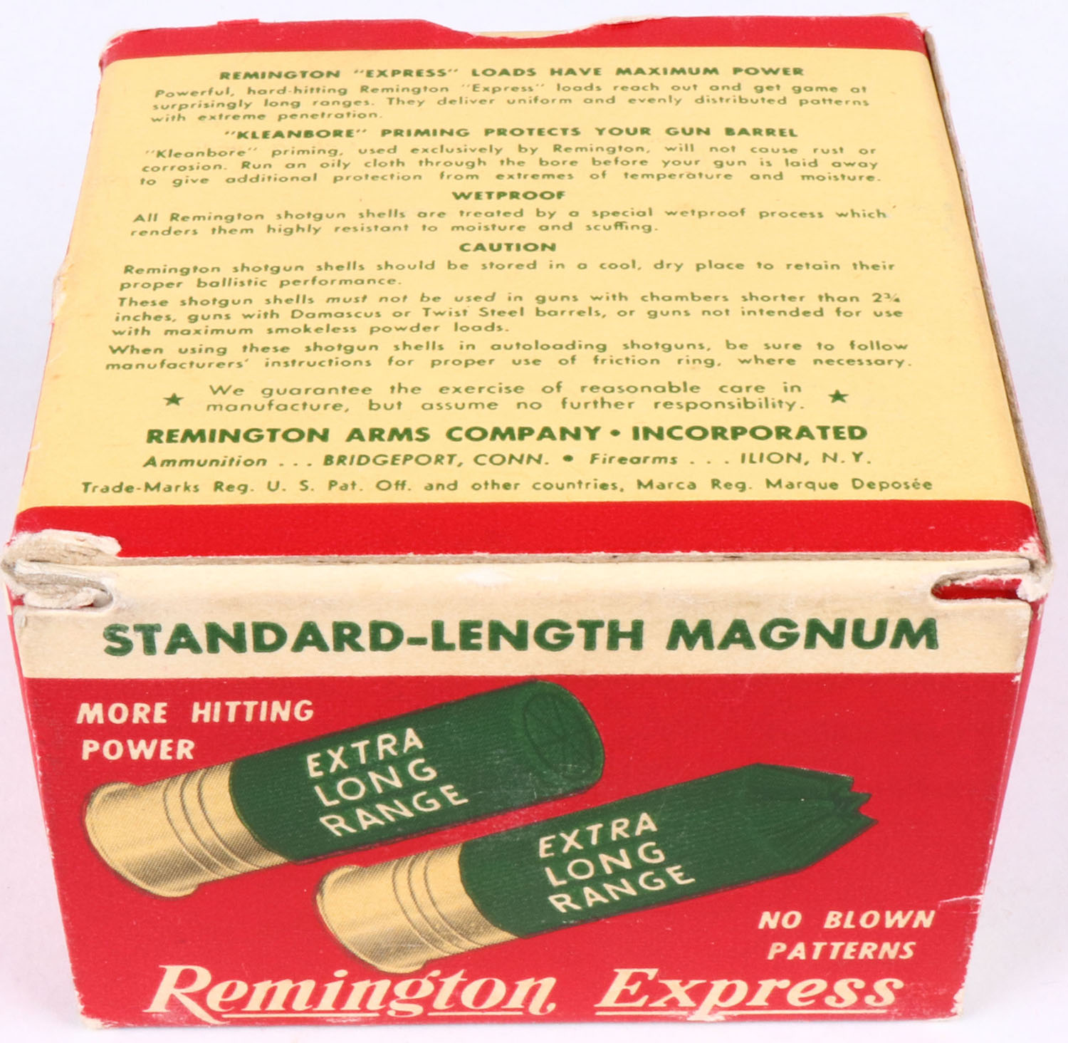 Remington, Express Kleanbore, 20ga., 2 3/4'', 1pc., Full, shot size 6 Magnum, box is red, white and green, box is solid, box has light edge wear & missing top inside flap with great colors, shells are excellent. Grade: Very Good ++ - Value: 10 to 30