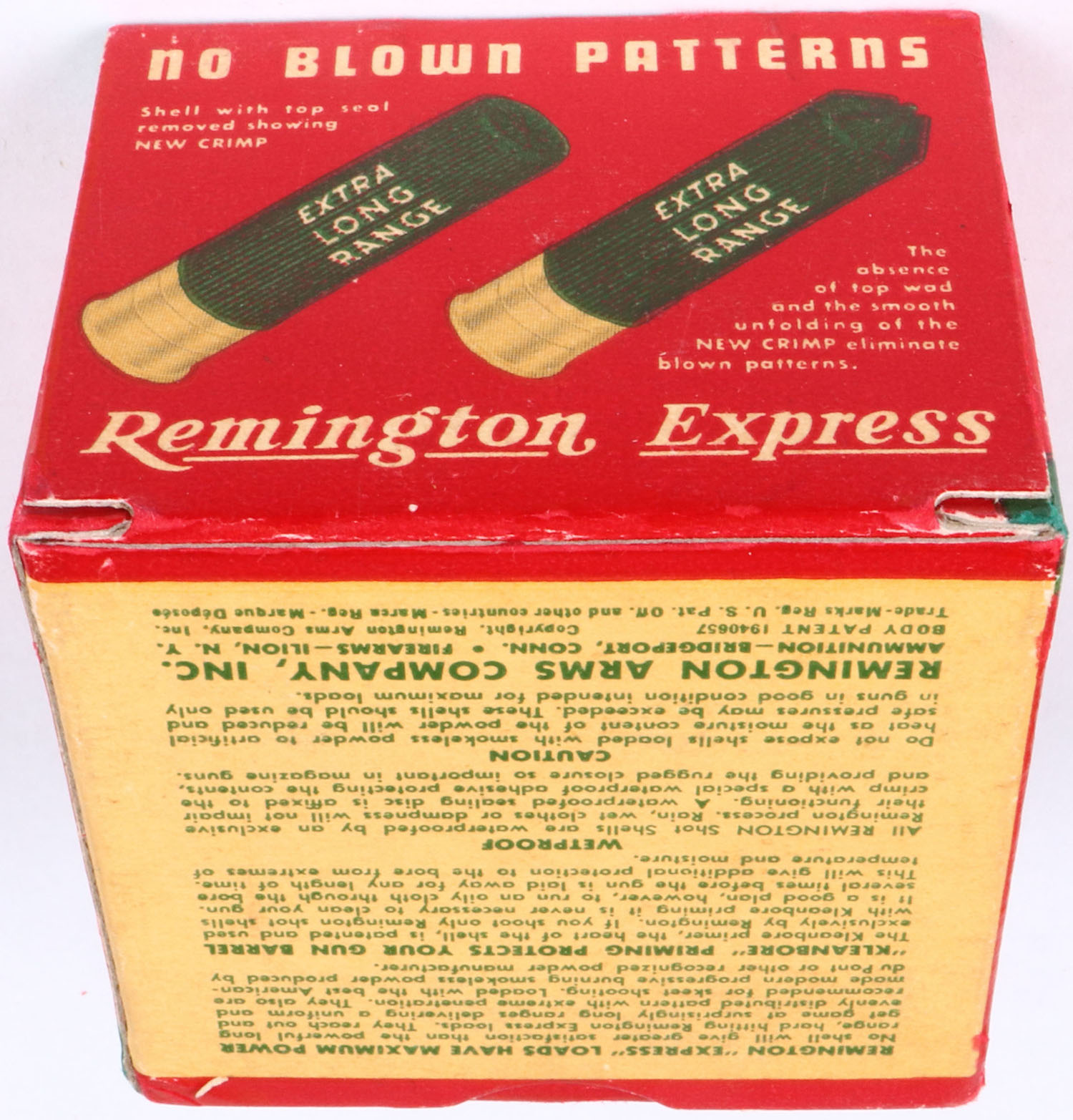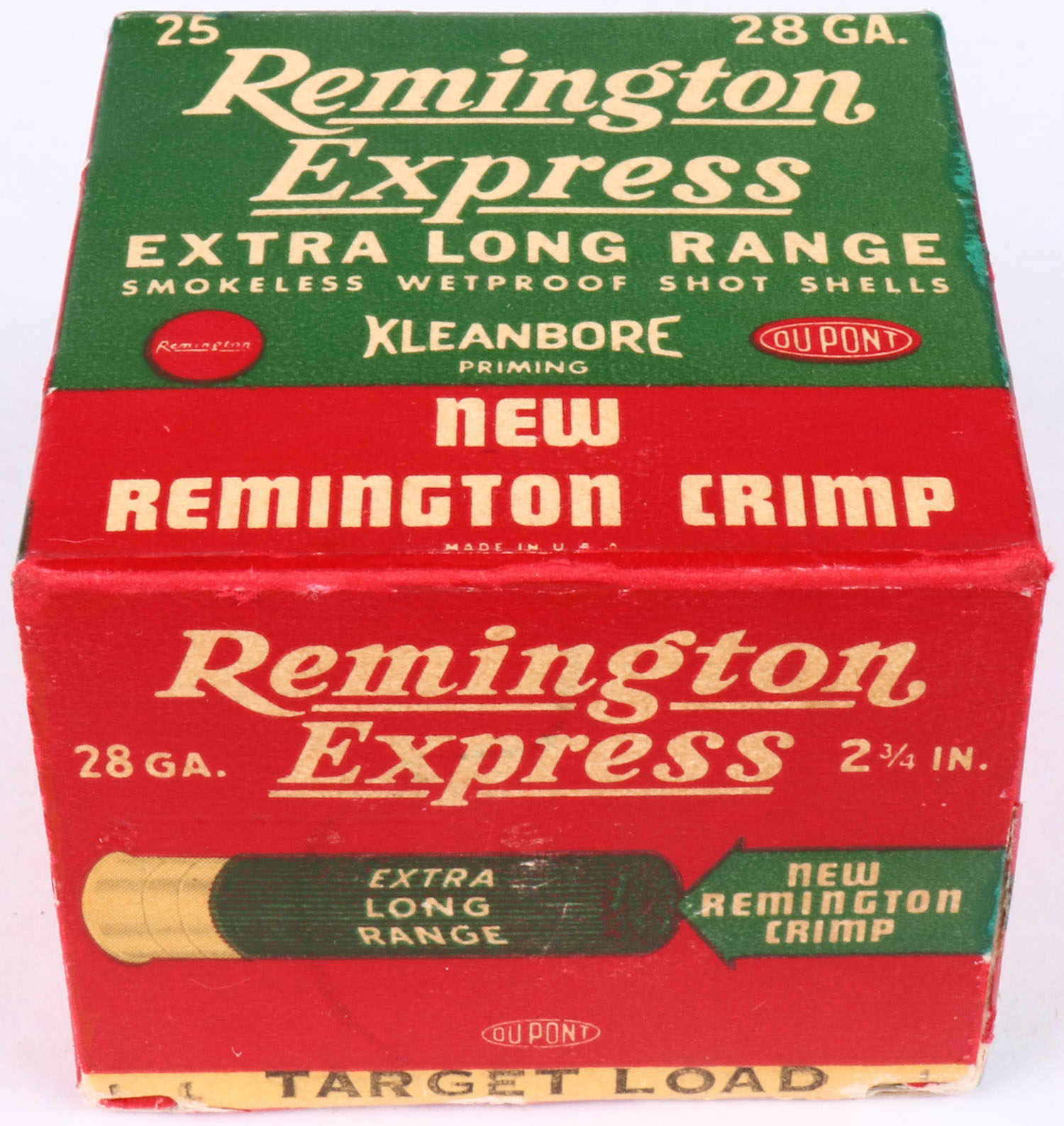 Remington, Express Kleanbore with insert, 28ga., 2 3/4'', 1pc., Full, shot size 9 Target Load, box is red, white and green, box is solid with great colors, shells are excellent. Grade: Excellent + - Value: 20 to 40