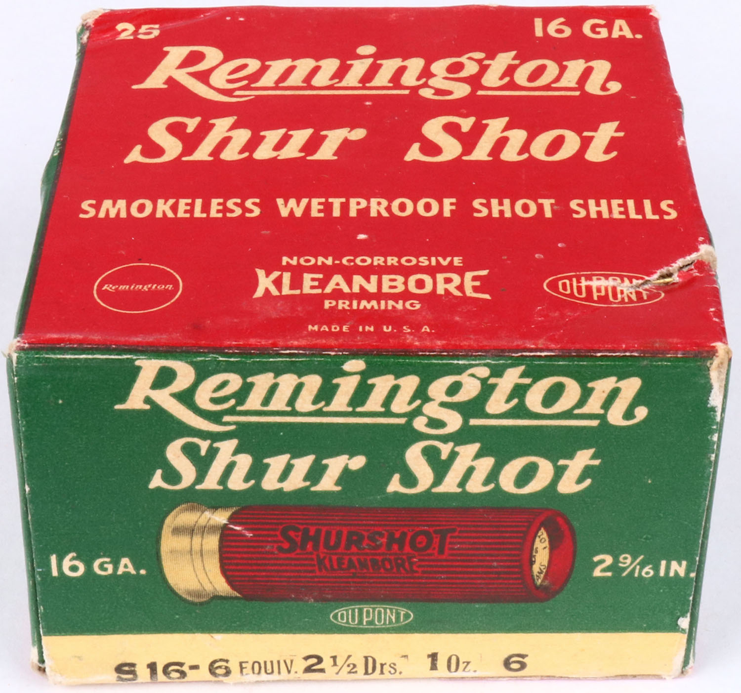 Remington, Shur Shot, 16ga., 2 9/16'', 1pc., Full, shot size 6, box is red, white and green, box has shell protrusions & tears with great colors, shells are excellent. Grade: Excellent - Value: 10 to 30