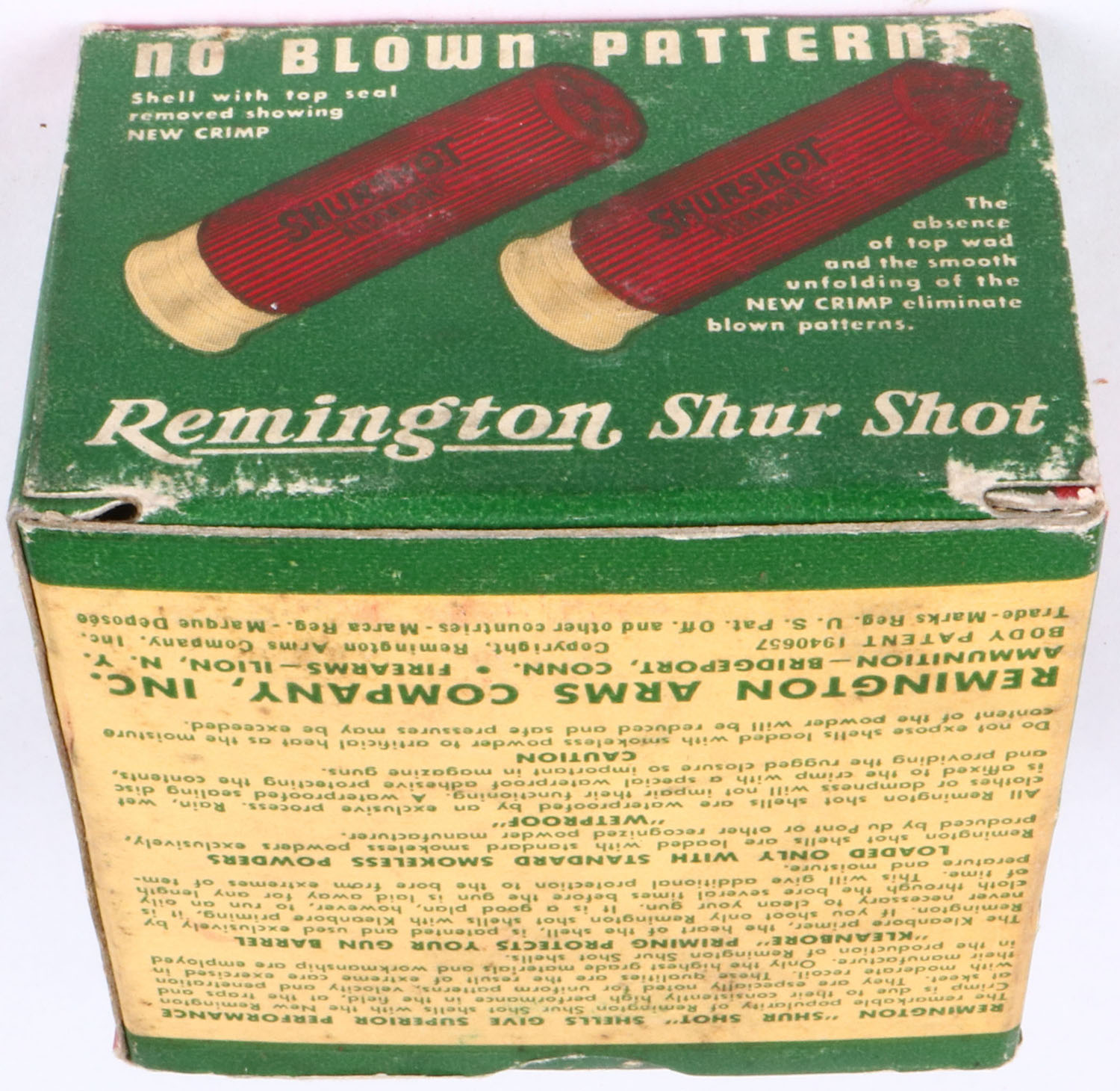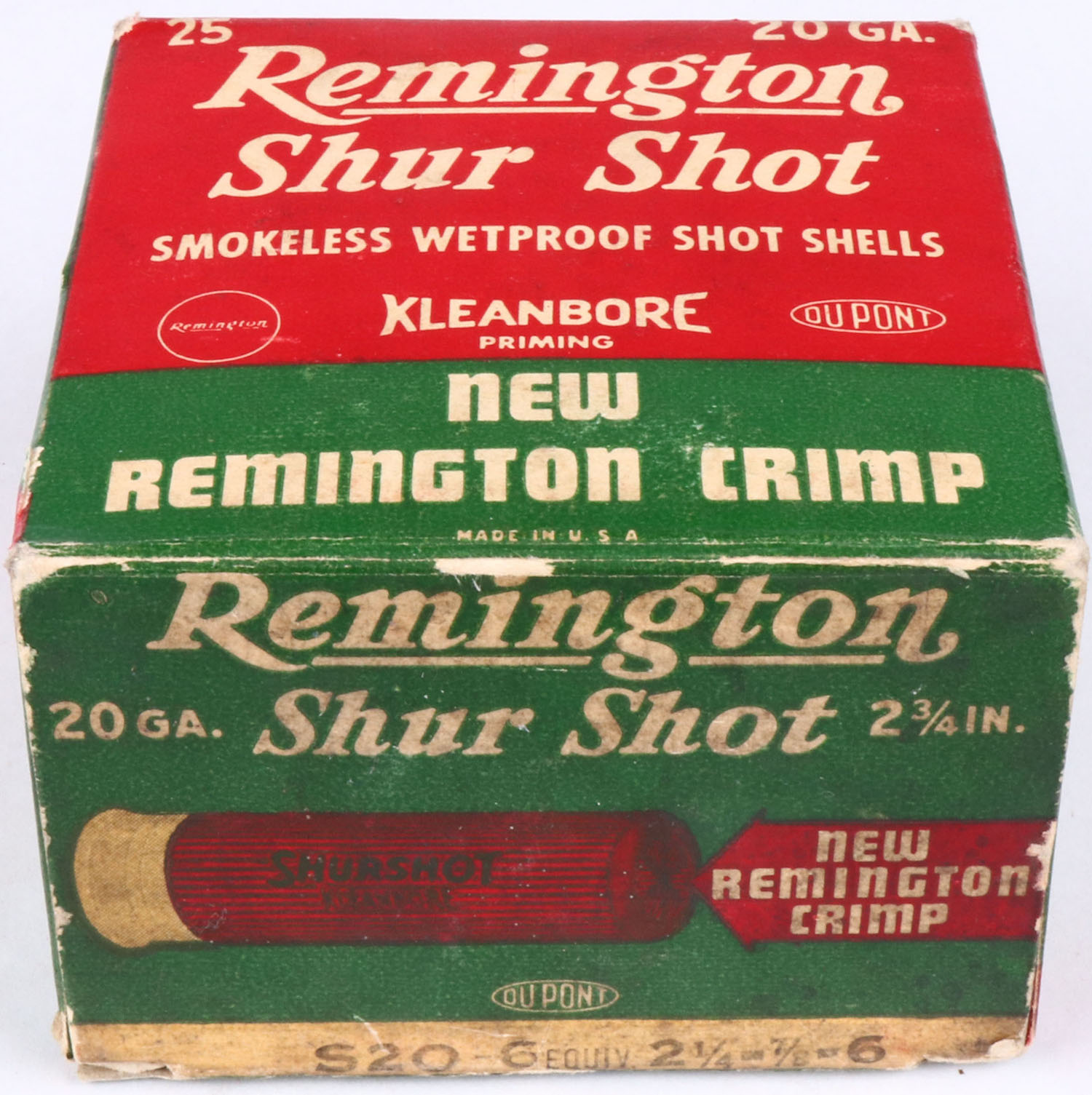 Remington, Shur Shot, 20ga., 2 3/4'', 1pc., Partial 24rds., shot size 6, box is red, white and green, box is solid, box has light edge wear, light soiling & light scuffing with very nice colors, shells are excellent. Grade: Excellent - Value: 10 to 30