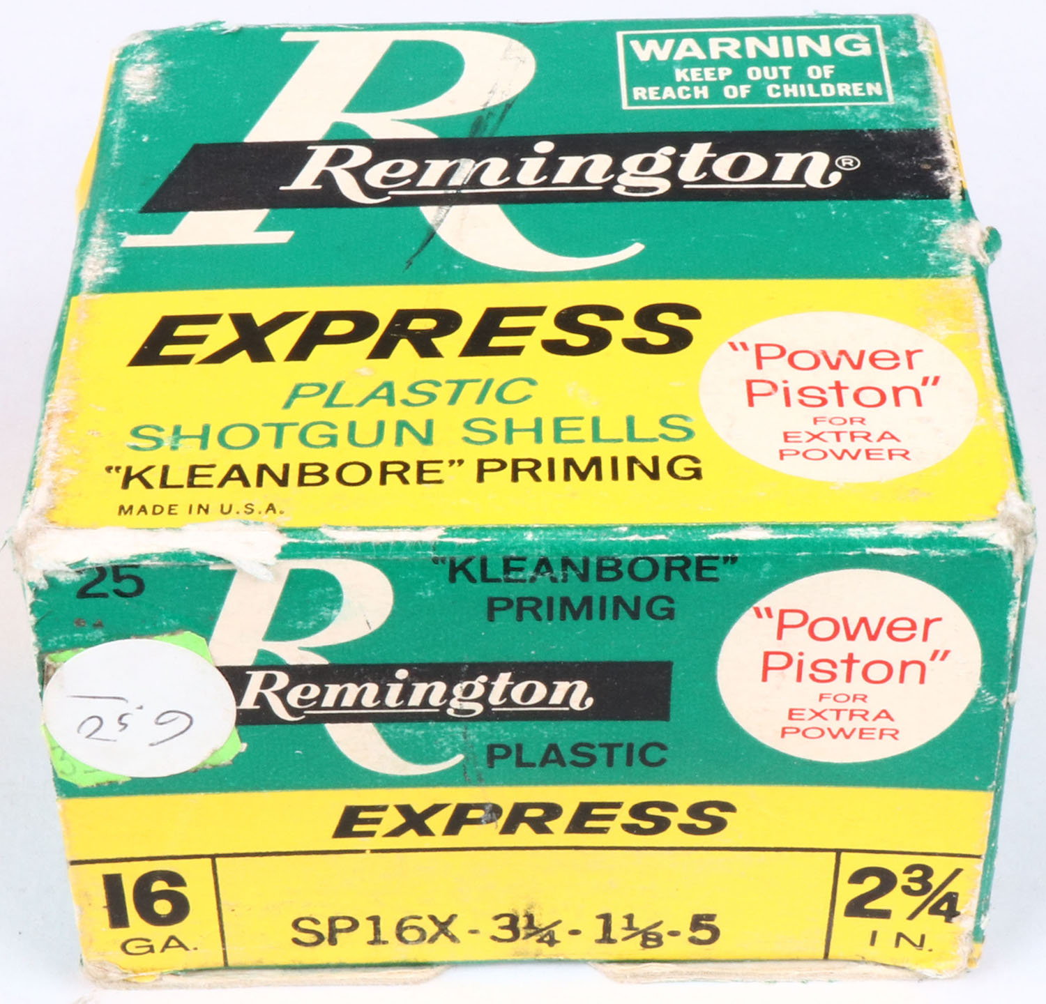 Remington, Express, 16ga., 1pc., Full with 10rds being incorrect, shot size 5, multi-colored box, shells are excellent. Grade: Very Good + - Value: 8 to 20