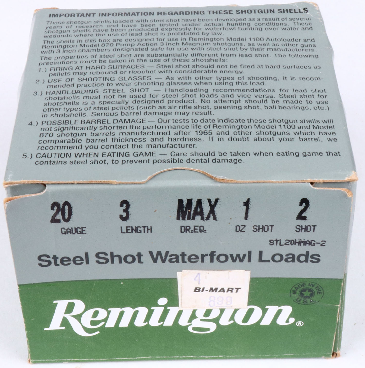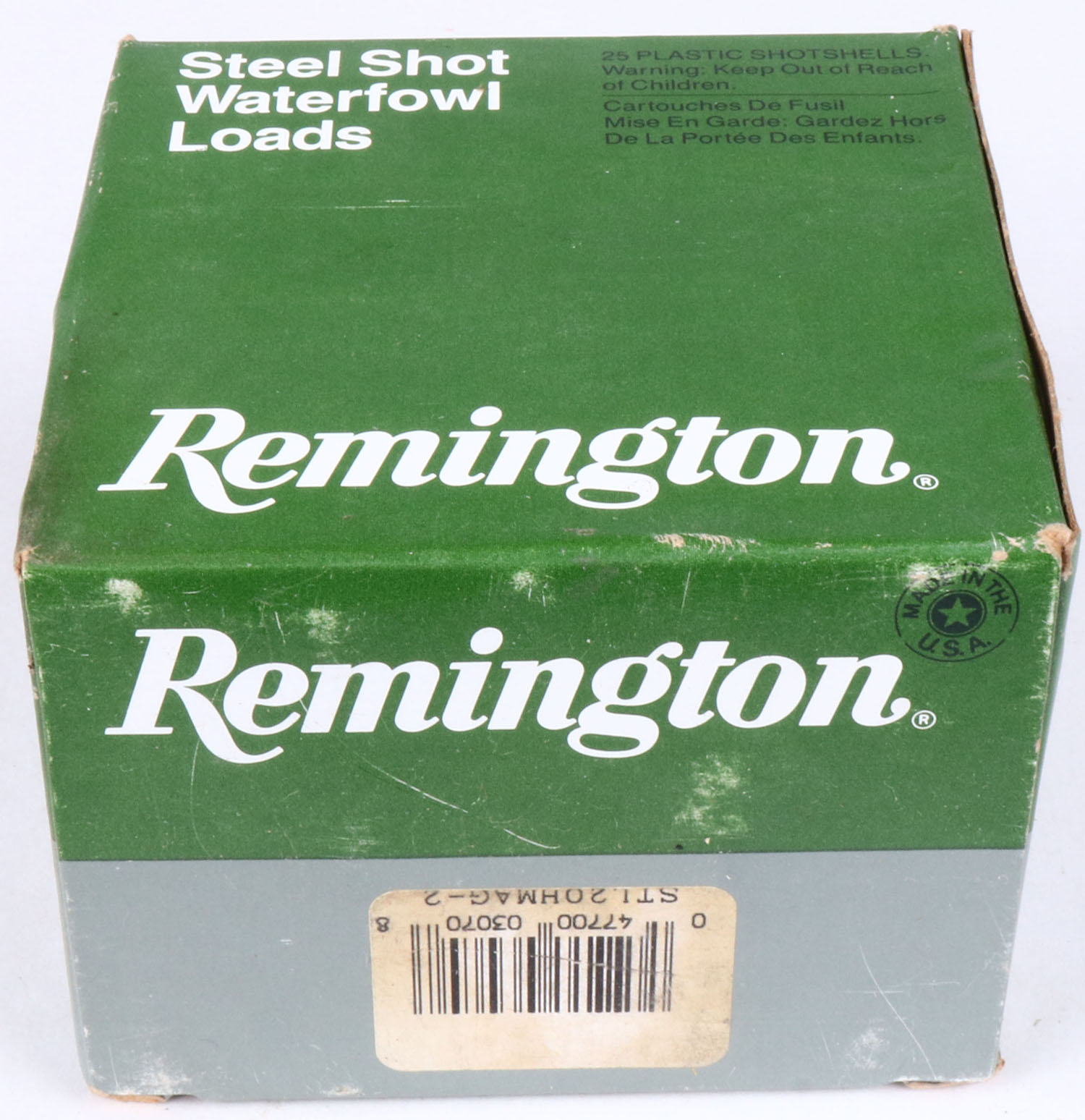 Remington, Steel Shot Waterfowl Load, 20ga., 1pc., Full, shot size 2, multi-colored box, shells are excellent. Grade: Excellent - Value: 8 to 20