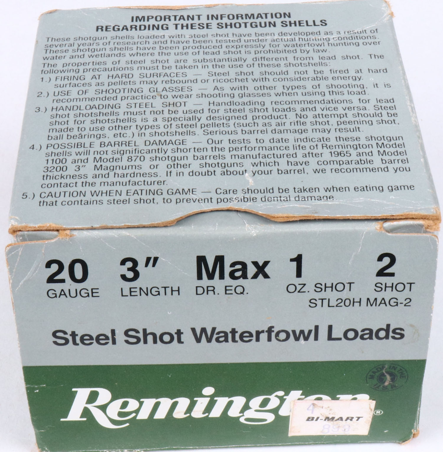 Remington, Steel Shot Waterfowl Load, 20ga., 1pc., Full with 11rds being incorrect, shot size 2, multi-colored box, shells are excellent. Grade: Excellent - Value: 8 to 20
