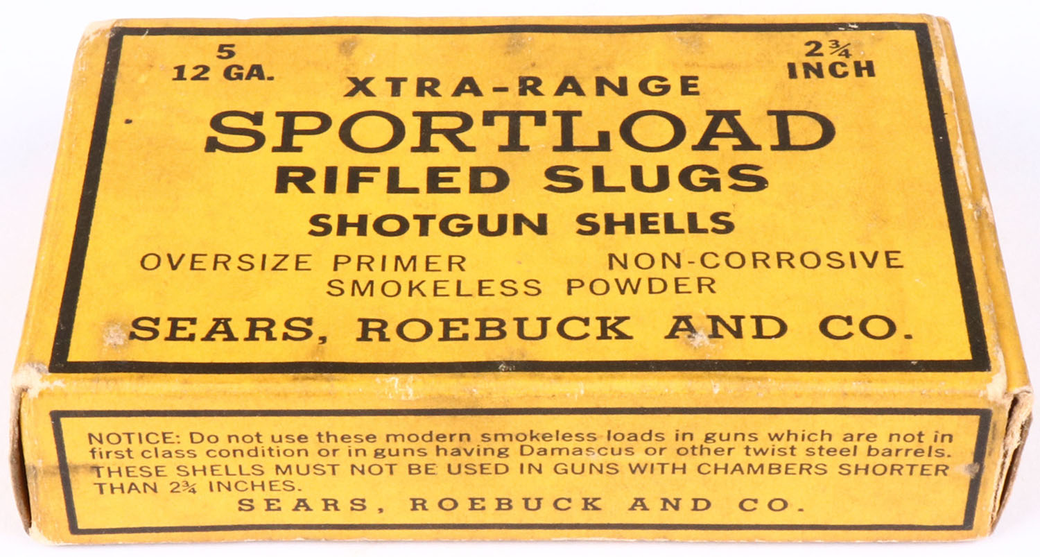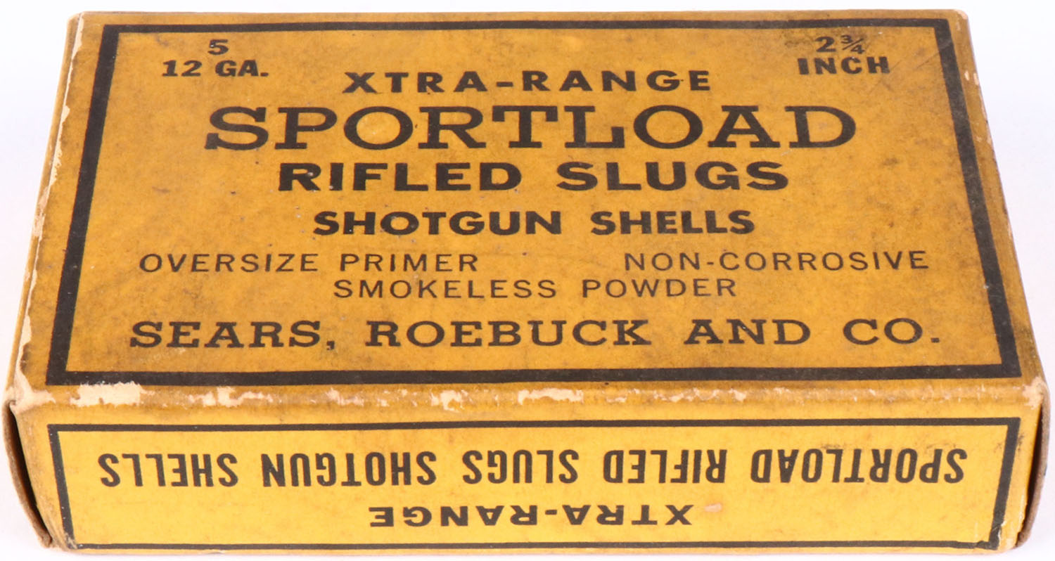 Sears, Sportload RIFLED SLUGS, 12ga, 2 3/4'', 1pc., Full, shot size Rifled Slug, yellow & black box, box has age soiling & is very solid with very nice colors, shells are excellent. Grade: Excellent - Value: 8 to 20