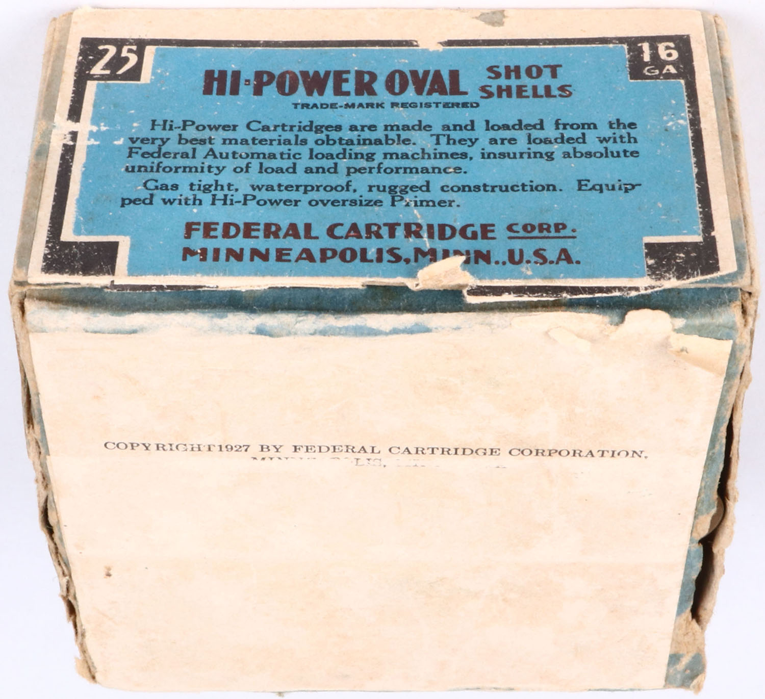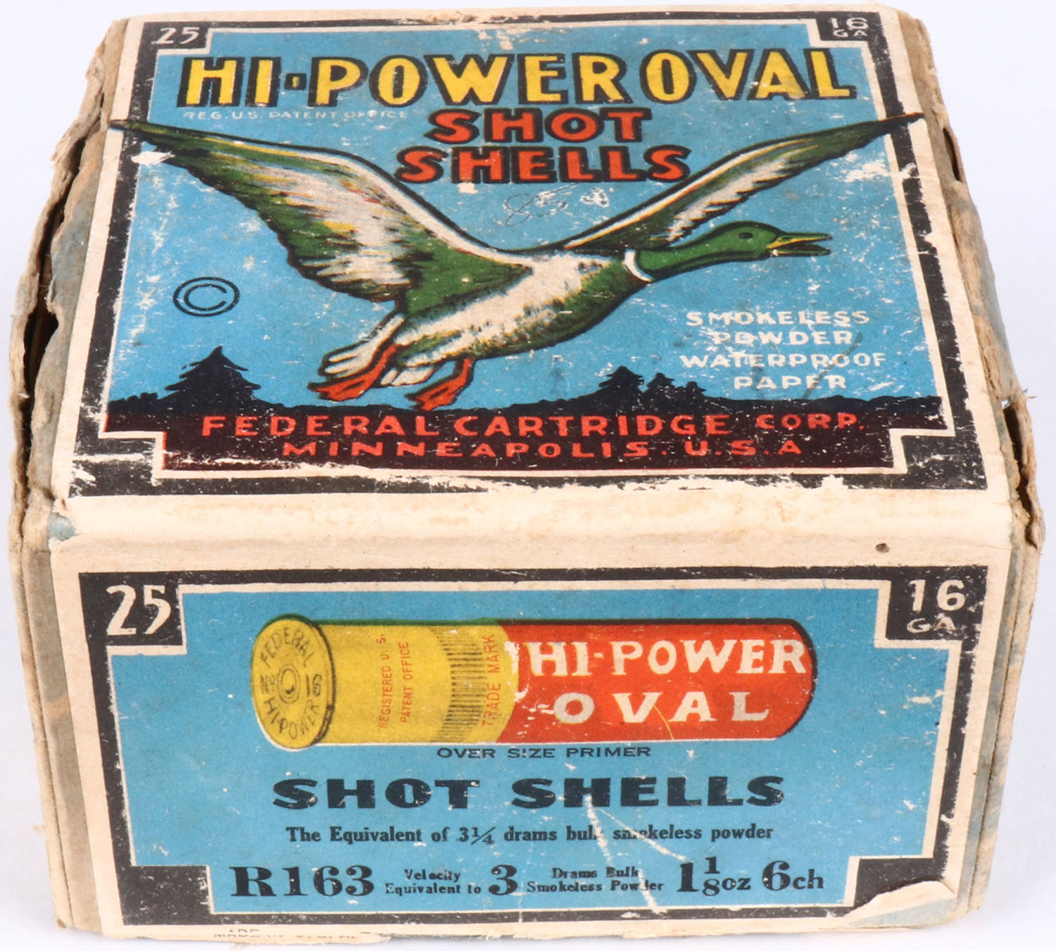 Federal Cart. Co., HI-POWER OVAL with INSERT, 16ga., 2 PIECE!, FULL, shot size 6ch, blue box with multi colored label that pictures Mallard in flight, box has seam splits, scuffing with very nice label, Shells are excellent. Grade: Very Good ++ - Value: 50 to 500
