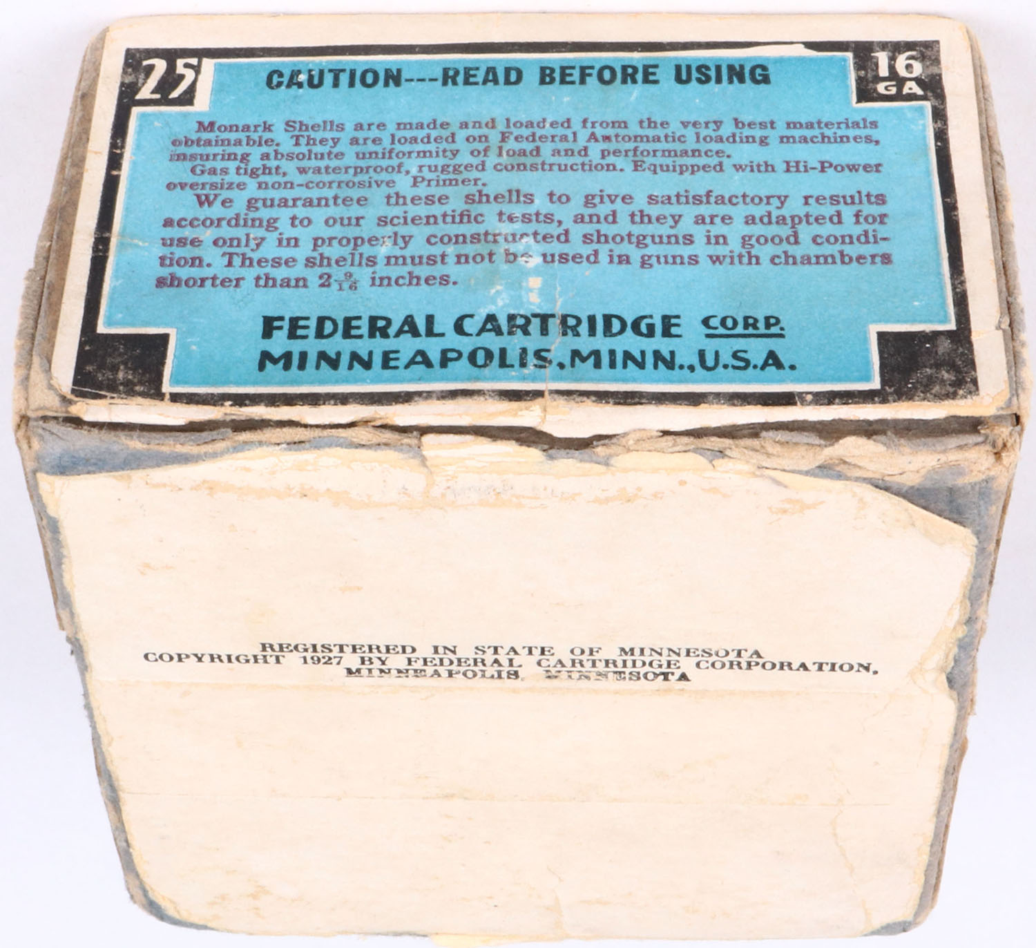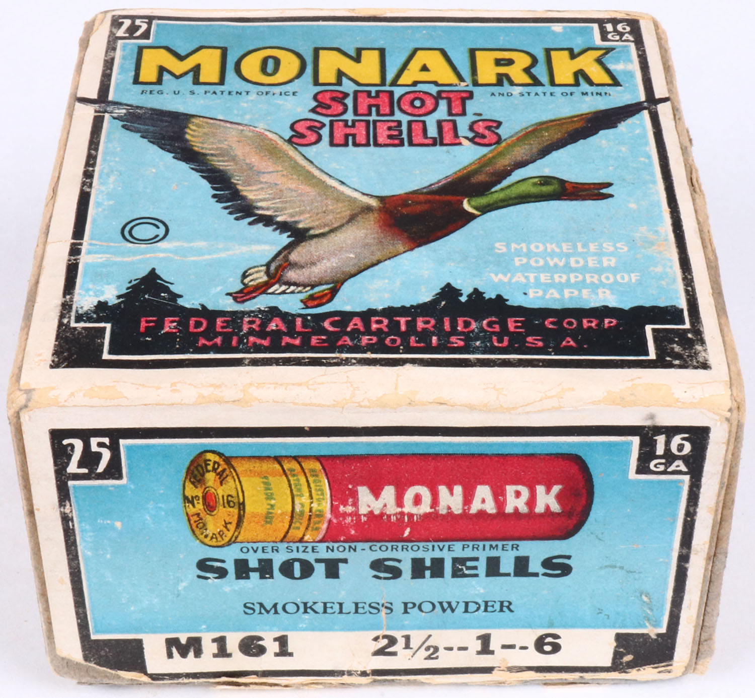 Federal Cart. Co., MONARK, 16ga., 2 PIECE!, Empty, shot size 6, blue box with multi colored label that pictures Mallard in flight, box has seam splits & scuffing with very nice label. Grade: Very Good ++ - Value: 50 to 150