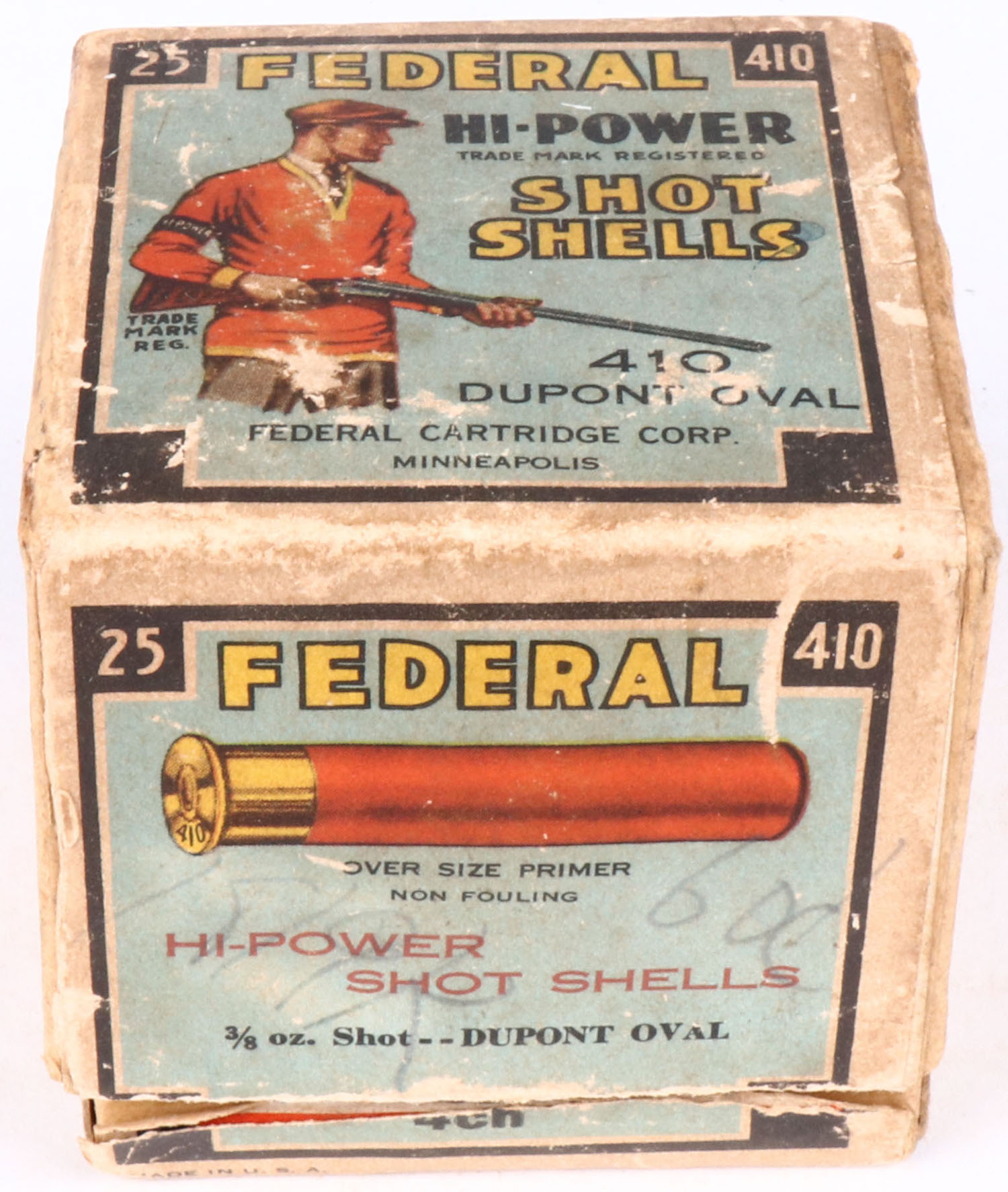 Federal Cart. Co., Hi-Power, 410ga., 2 PIECE!, Partial 20rds., shot size 4ch, buff box with black border, blue, buff and red label with trap shooter in red sweater, box is solid with scuffing & soiling, Shells are excellent. Grade: Very Good ++ - Value: 100 to 400