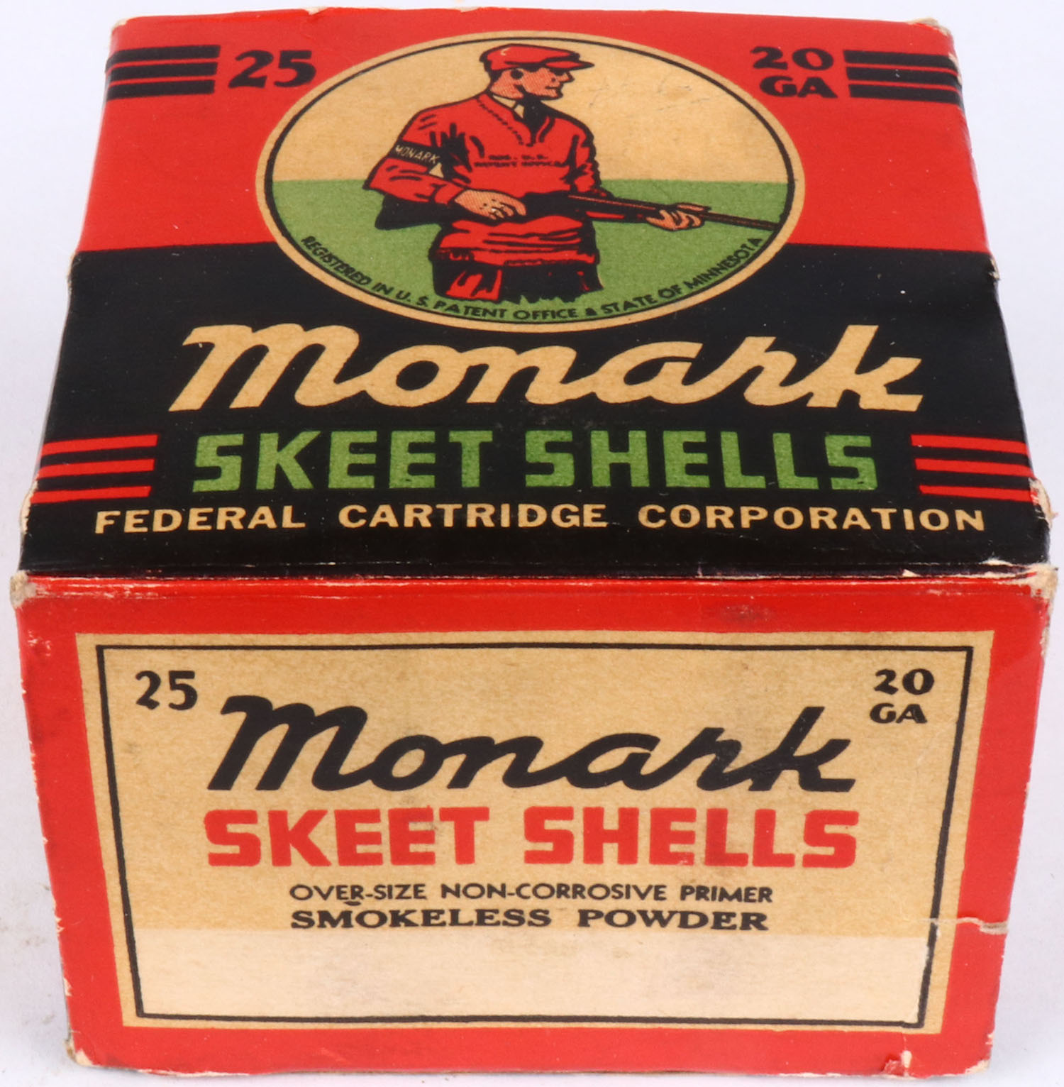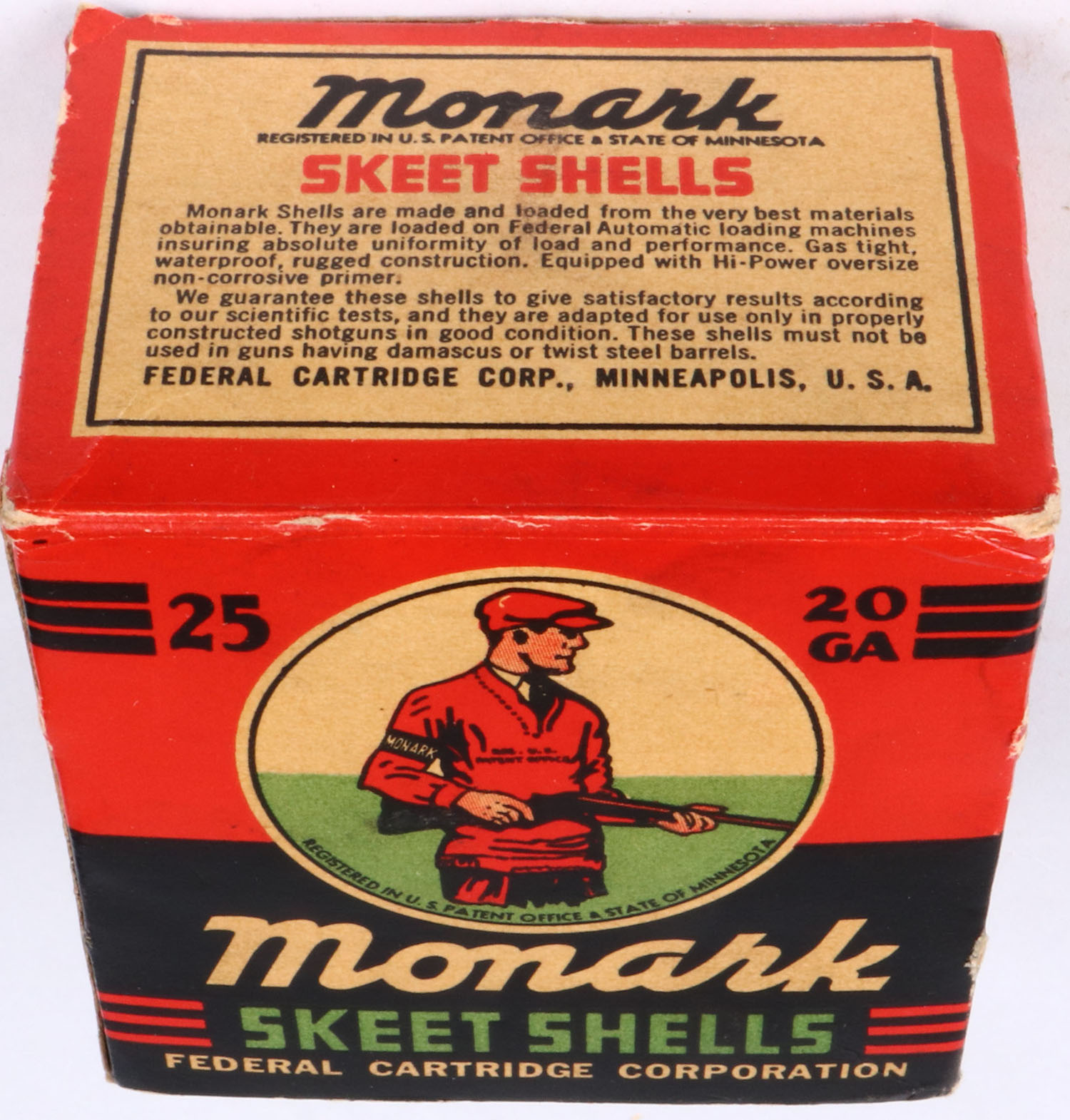 Federal Monark, Skeet Shells, 20ga., 1pc., Empty, shot size ?, red, green & black box that pictures trap shooter with red sweater & cap, box has light edge wear & great colors. Grade: Excellent + - Value: 20 to 40
