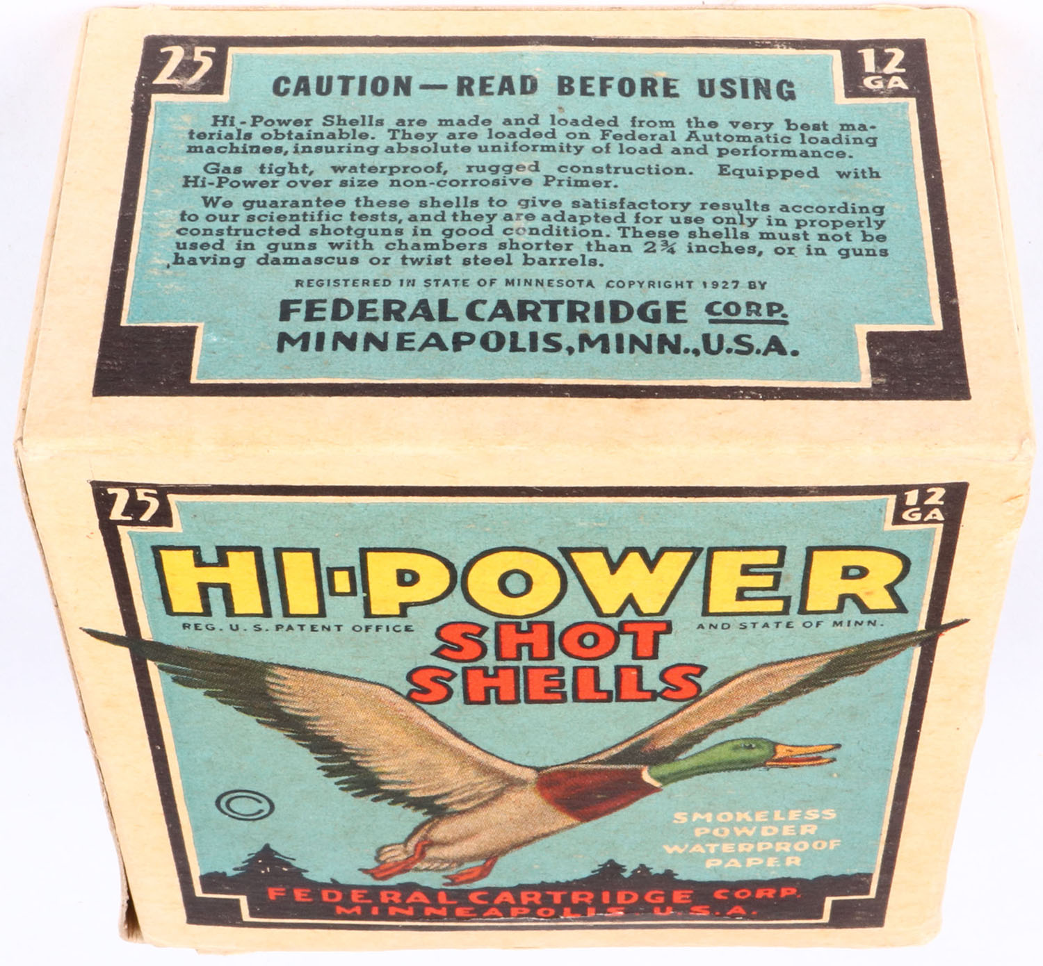 Federal Cart. Co., HI-POWER, 12ga., 1pc., Partial 22rds, shot size 4, Black border, blue, yellow and red box with flying mallard, box has top flap disconnected with very nice color, shells are very good. Grade: Very Good ++ - Value: 20 to 60