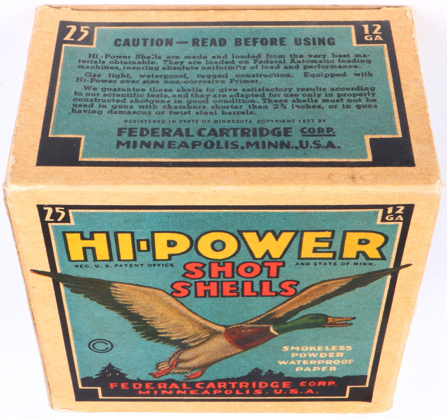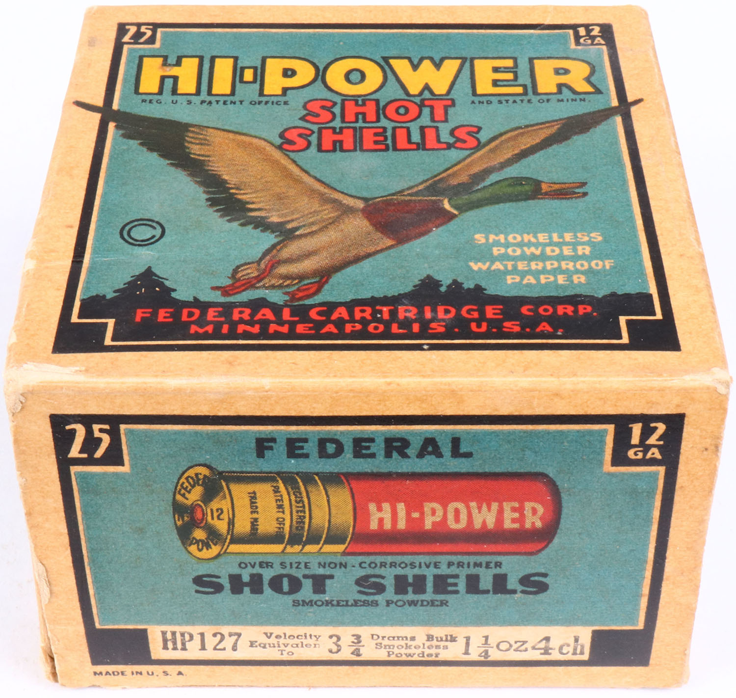 Federal Cart. Co., HI-POWER, 12ga., 1pc., Empty, shot size 4ch, Black border, blue, yellow and red box with flying mallard, box is solid with great color. Grade: Excellent - Value: 10 to 40