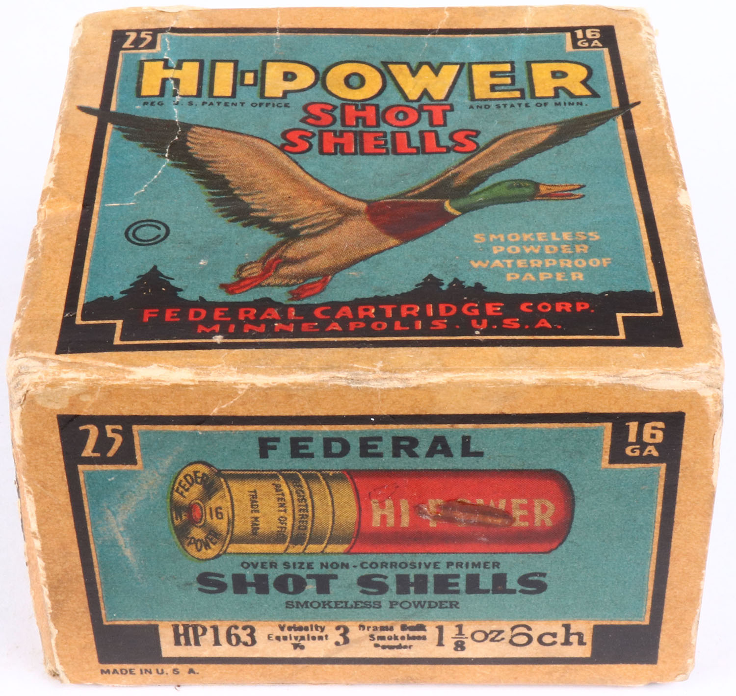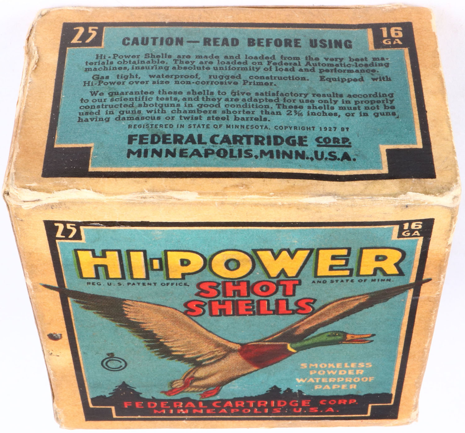 Federal Cart. Co., HI-POWER, 16ga., 1pc., Partial 3rds., shot size 6ch, Black border, blue, yellow and red box with flying mallard, box has edge wear & light soiling with very nice color, Shells are excellent. Grade: Very Good ++ - Value: 10 to 40