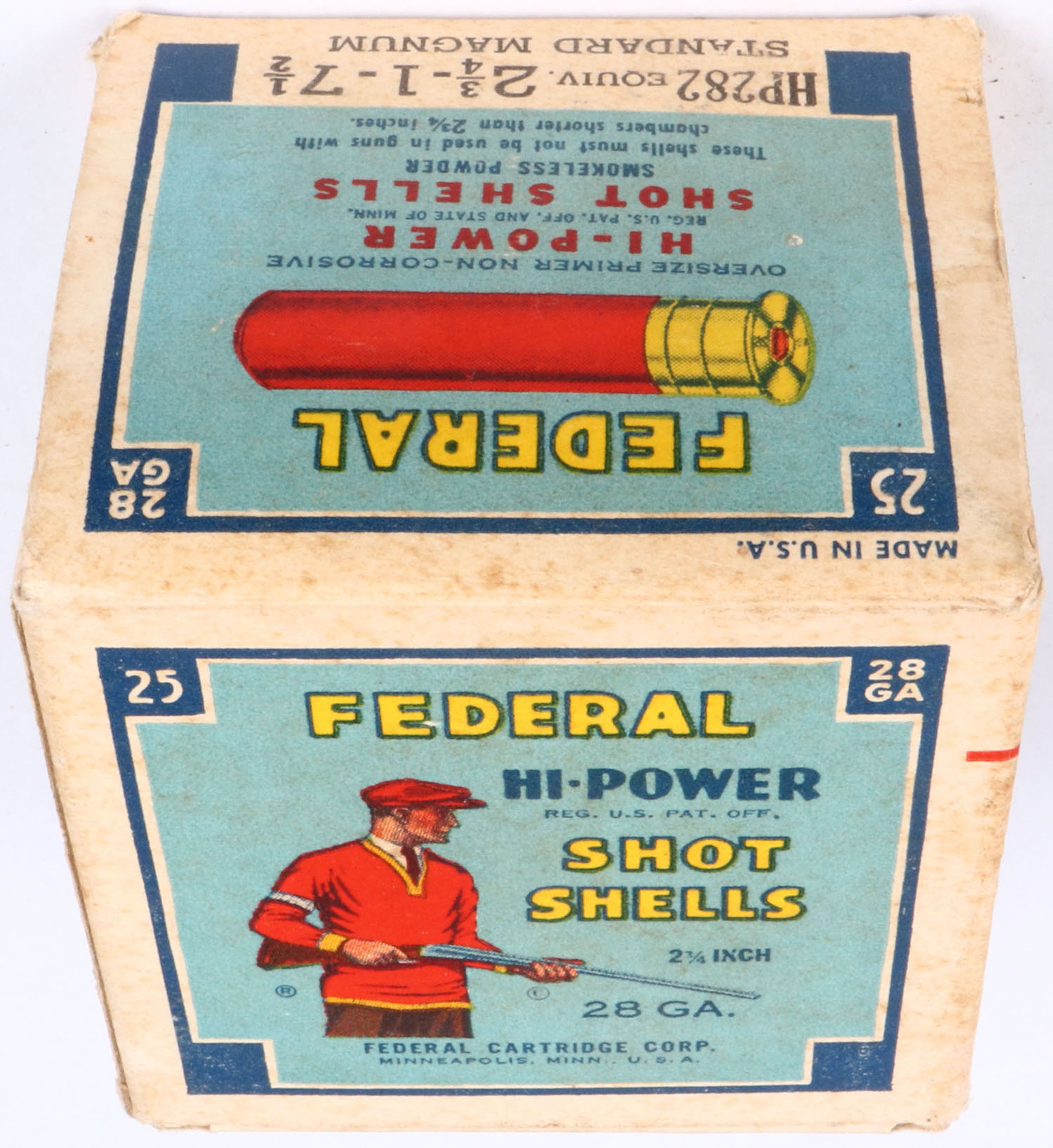 Federal Cart. Co., HI-POWER, 28ga., 1pc., Full, shot size 7 1/2, Blue border, blue, yellow and red box with trap shooter, box has light scuffing, light soiling with great color, shells are very good. Grade: Excellent - Value: 20 to 60