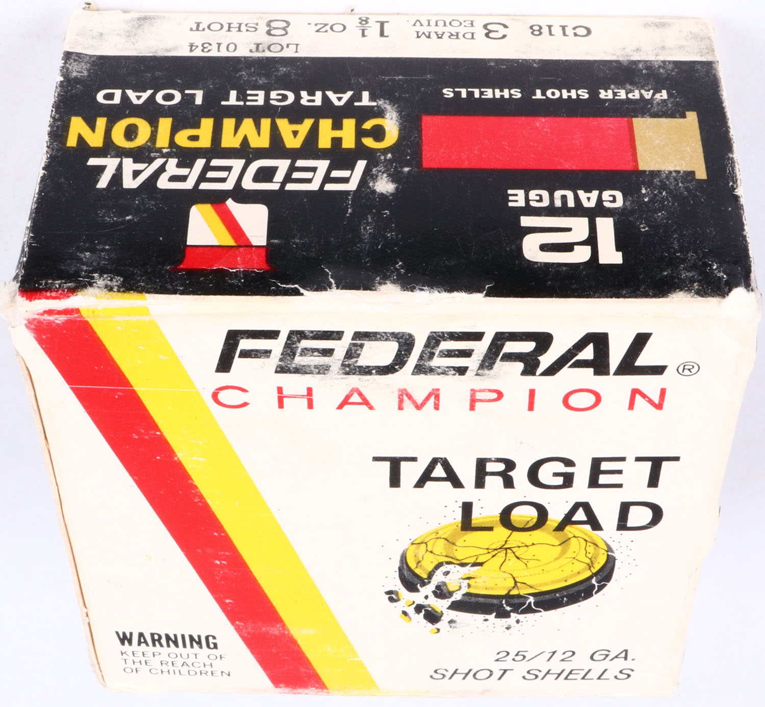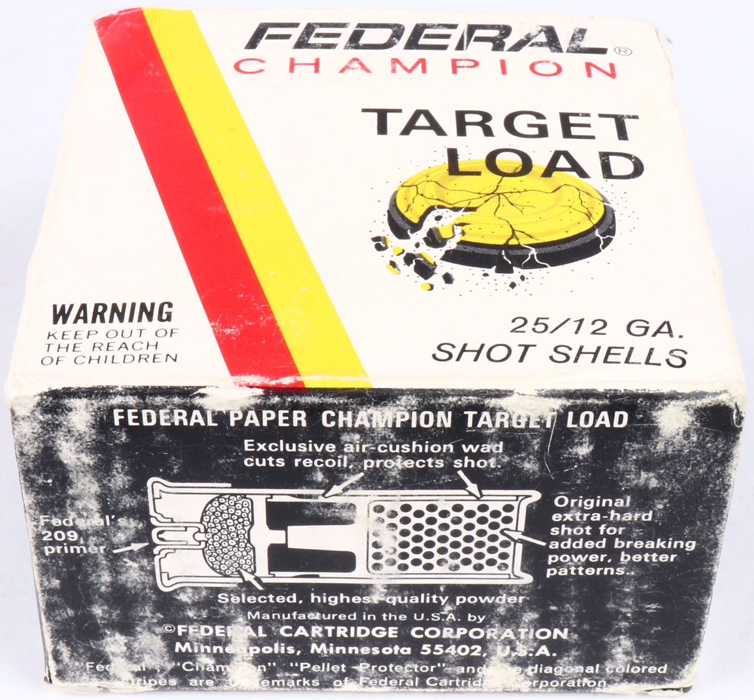 Federal, Champion Target Load, 12ga., 1pc., Full, shot size 7 1/2, multi-colored box, shells are excellent. Grade: Very Good ++ - Value: 8 to 20