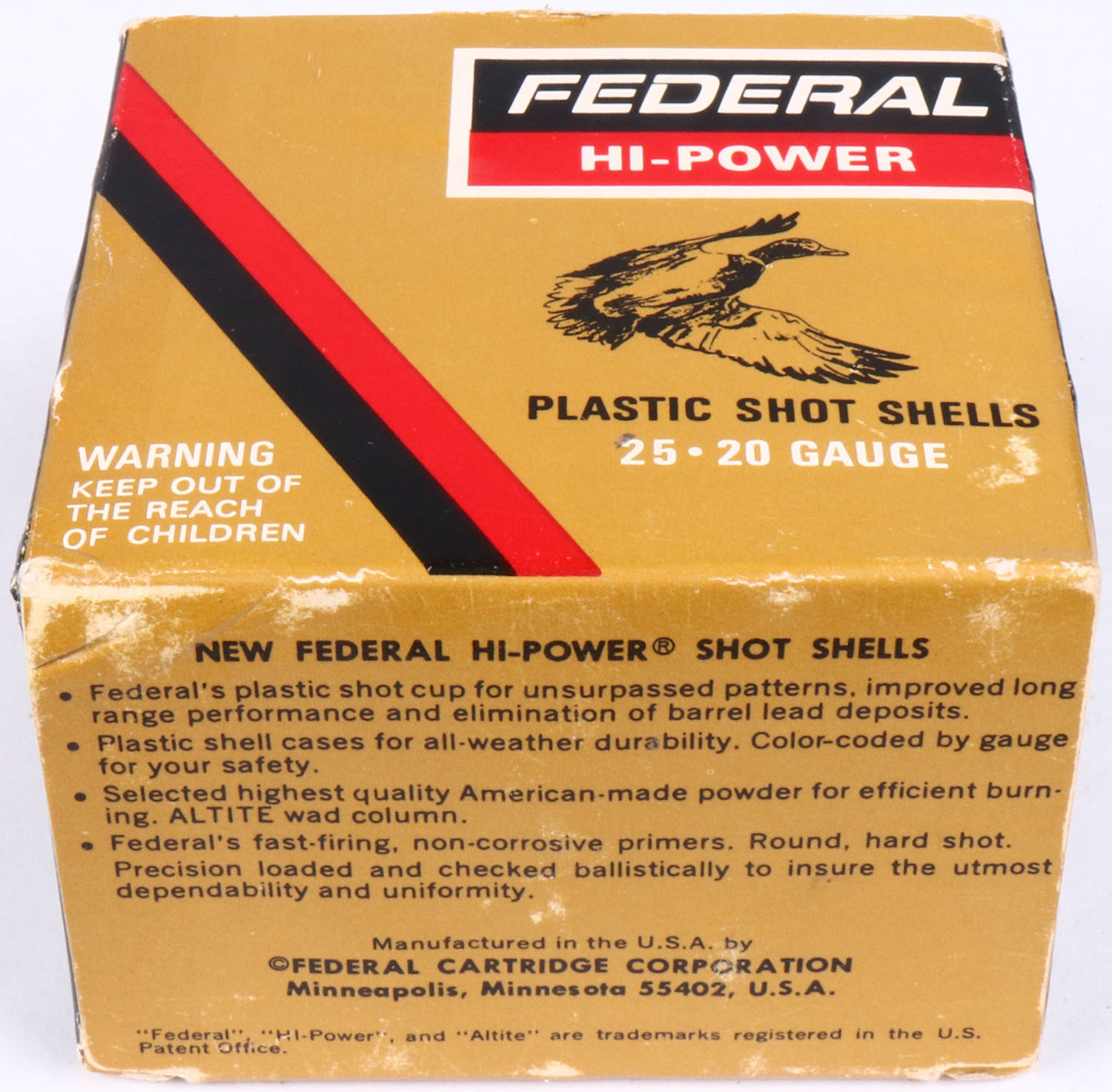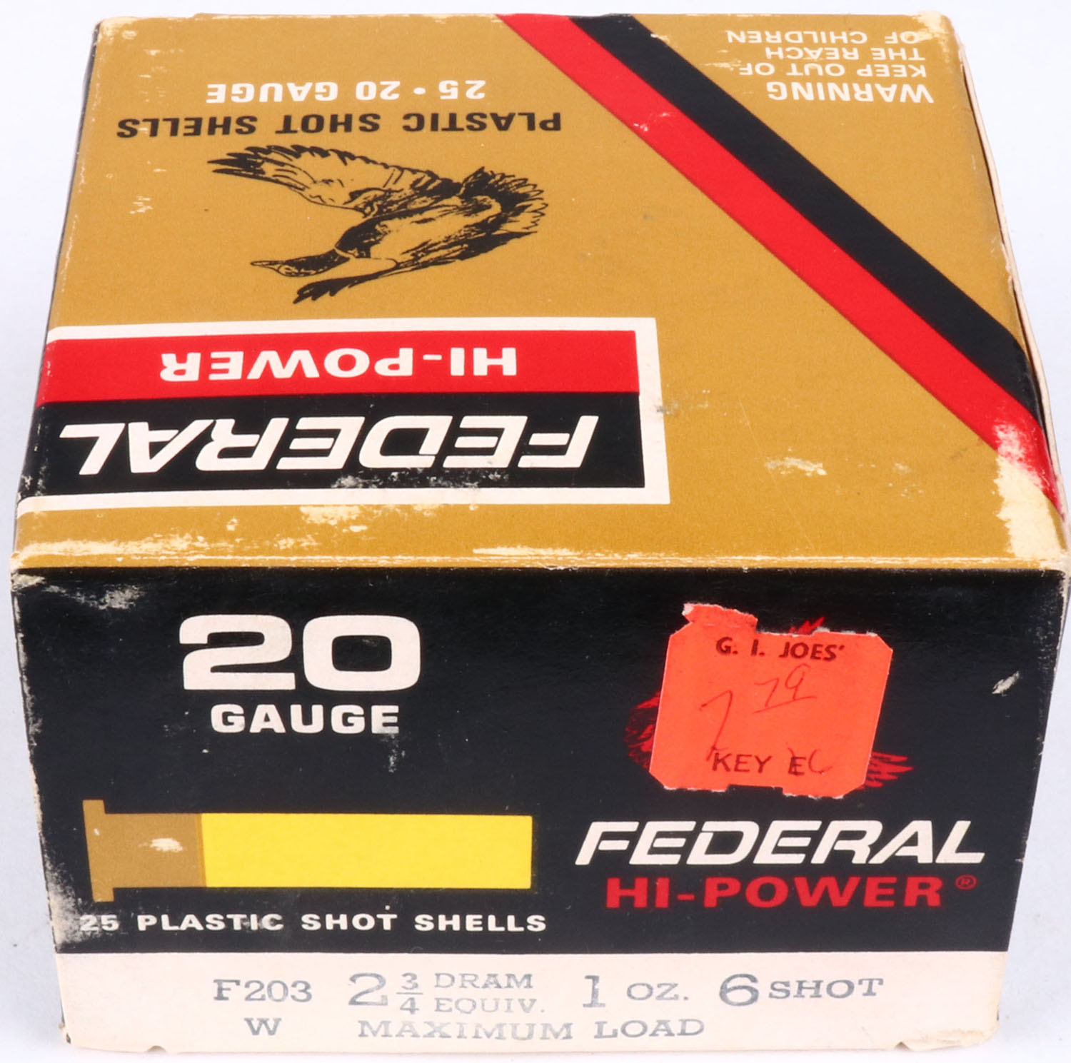 Federal, Hi-Power, 20ga., 1pc., Full, shot size 6, multi-colored box, shells are excellent. Grade: Excellent - Value: 8 to 20