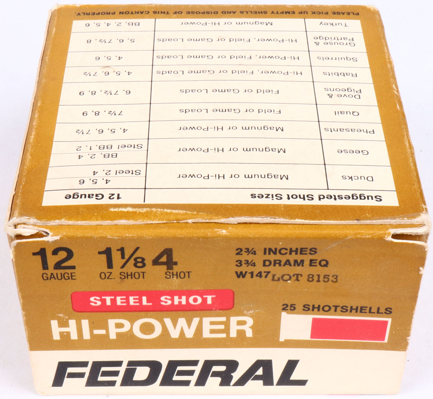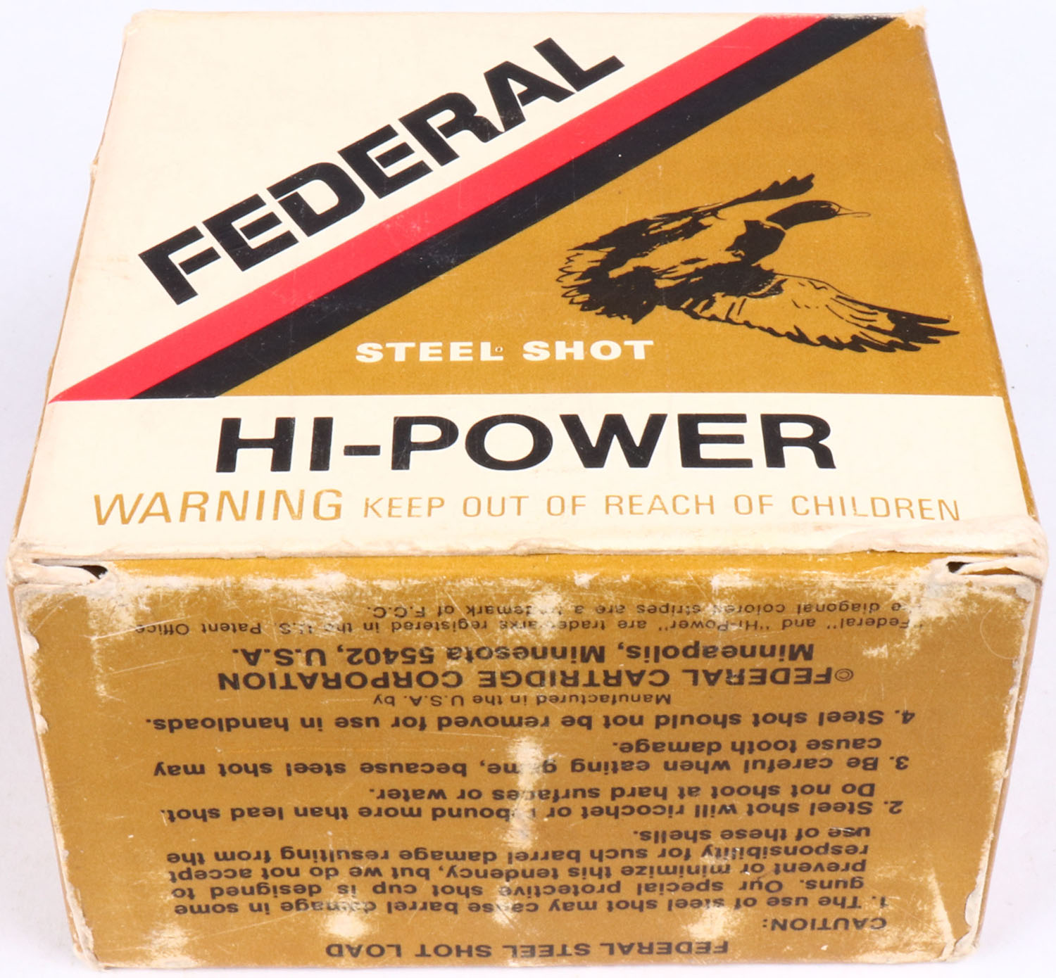 Federal, Hi-Power, 12ga., 1pc., Partial 24rds., shot size 4 Steel Shot, multi-colored box, shells are excellent. Grade: Excellent - Value: 8 to 20