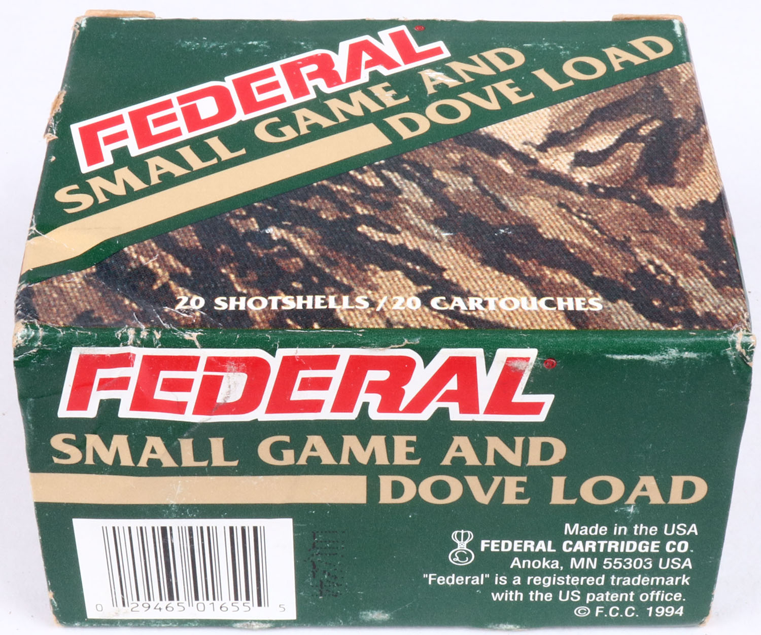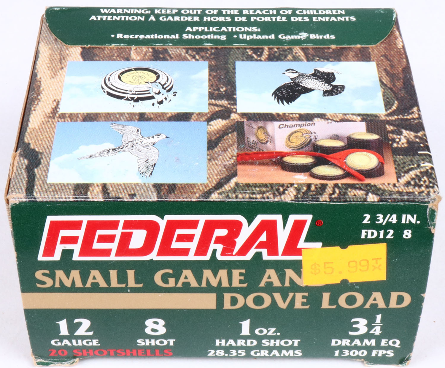 Federal, Small Game & Dove Load, 12ga., 1pc., Full, shot size 8, multi-colored box, shells are excellent. Grade: Excellent - Value: 8 to 20