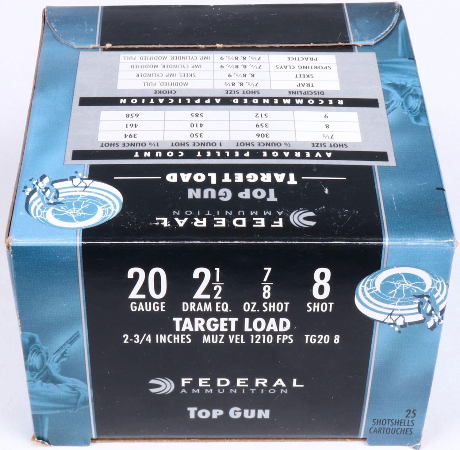 Federal, Target Load, 20ga., 1pc., Full, shot size 8, multi-colored box, shells are excellent. Grade: Excellent - Value: 8 to 20