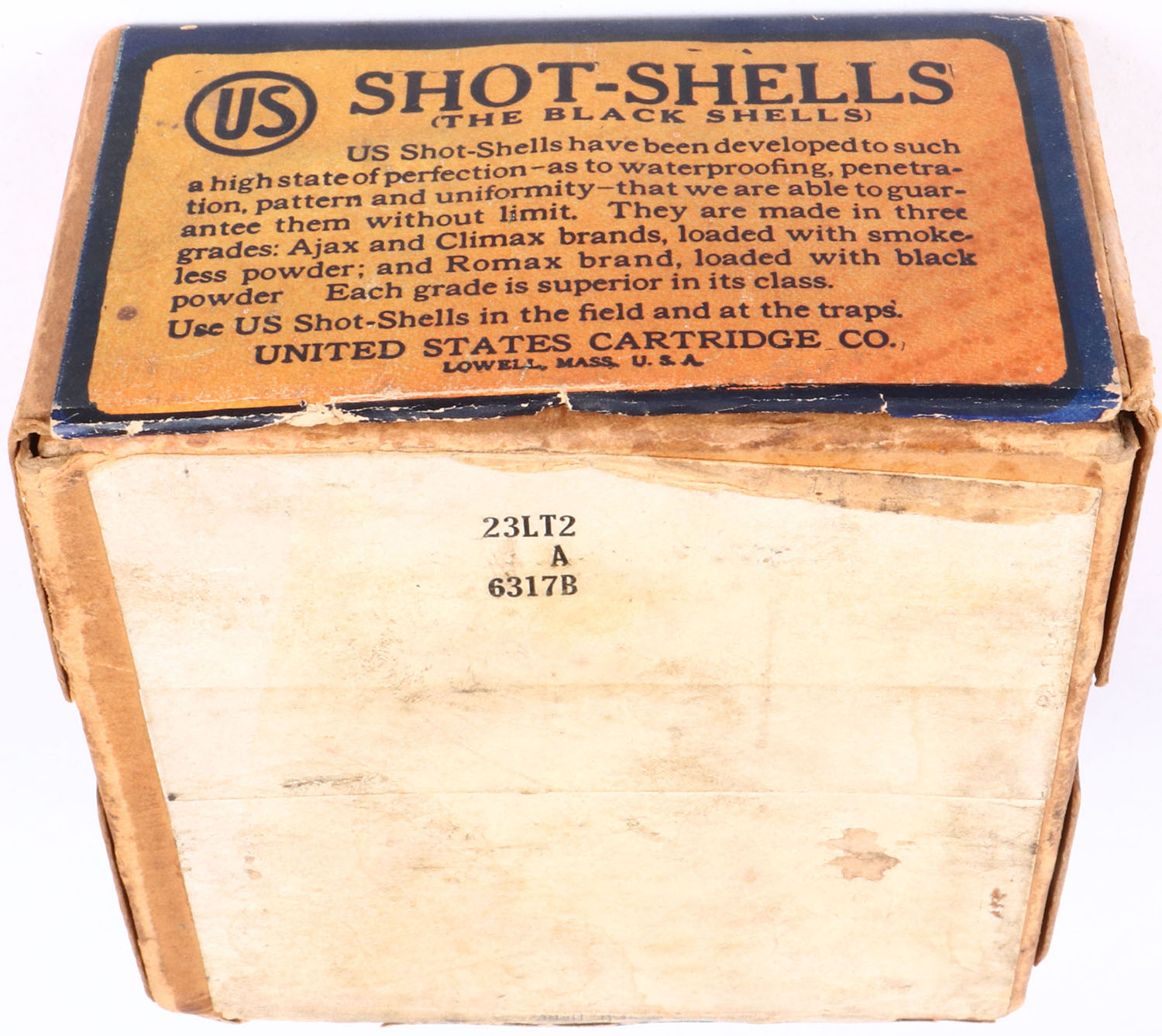 US Cart. Co., Lowell, Mass, Climax, 12ga, 2pc., Empty, shot size 4, buff box orange, blue & white label, box has age soiling, seam splits, light edge wear & puncture on top of box with very nice colors. Grade: Very Good + - Value: 20 to 100
