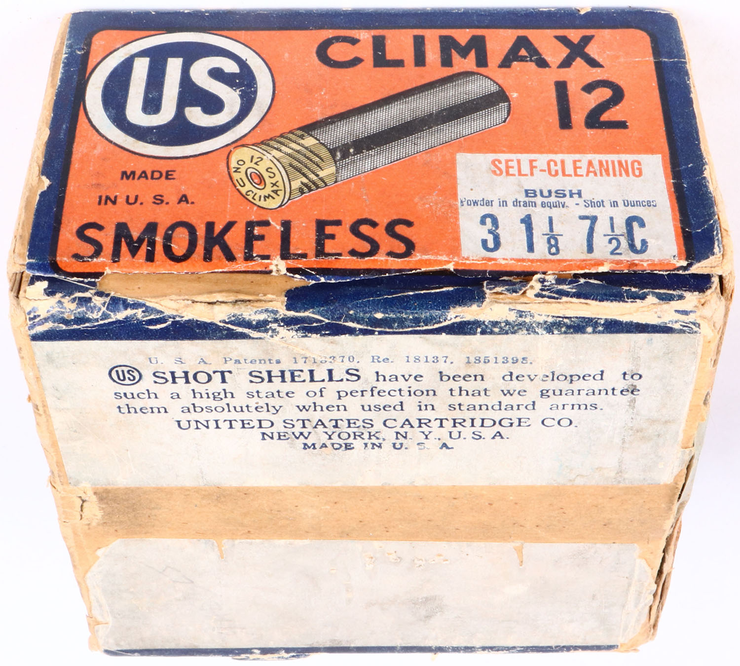 US Cart. Co., New York, N.Y, Climax, 12ga, 2pc., Partial 13rds., shot size 7 1/2C, buff box orange, blue & white label, box has light age soiling, tape repair & edge wear with very nice colors. Grade: Very Good ++ - Value: 40 to 120
