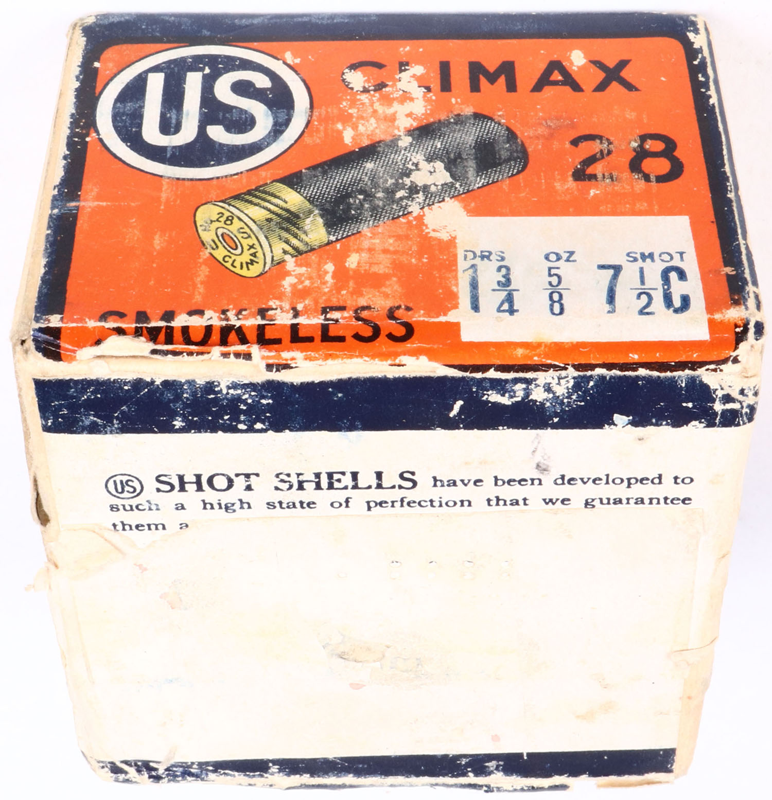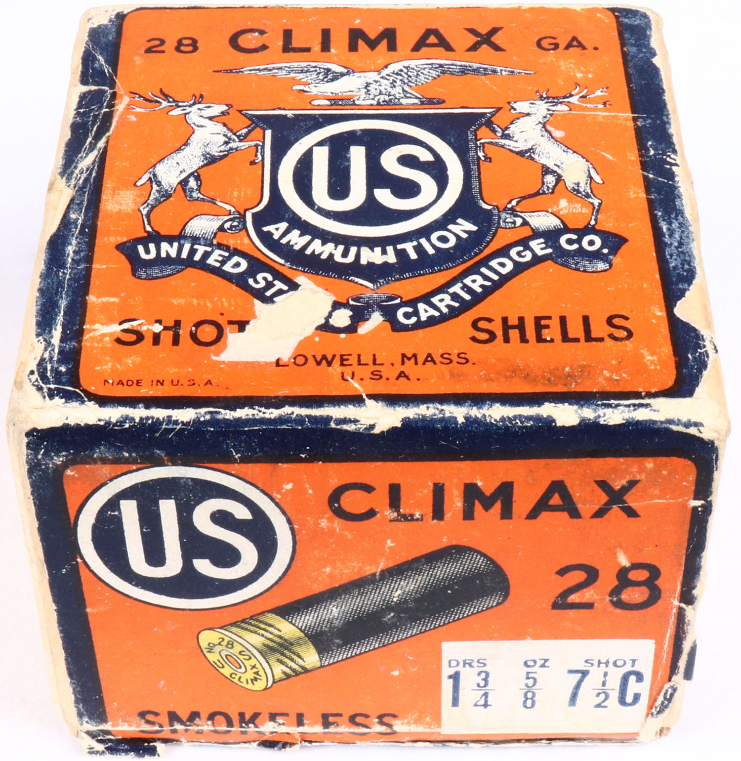US Cart. Co., Lowell, Mass, Climax, 28ga, 2pc., Full, shot size 7 1/2C, buff box orange, blue & white label, box has scuffing, light soiling & small shell protrusion with great colors. Grade: Excellent - Value: 40 to 120