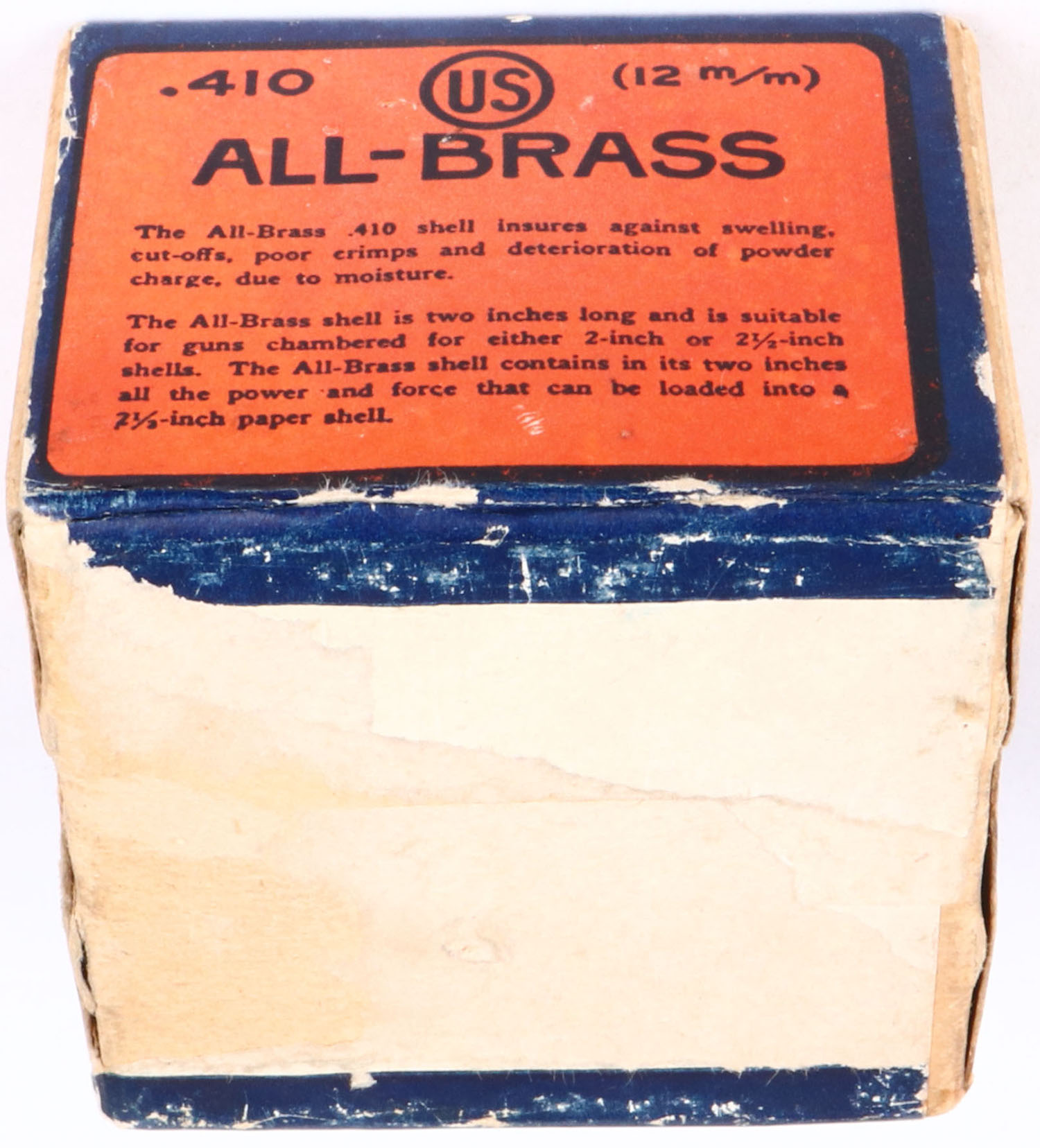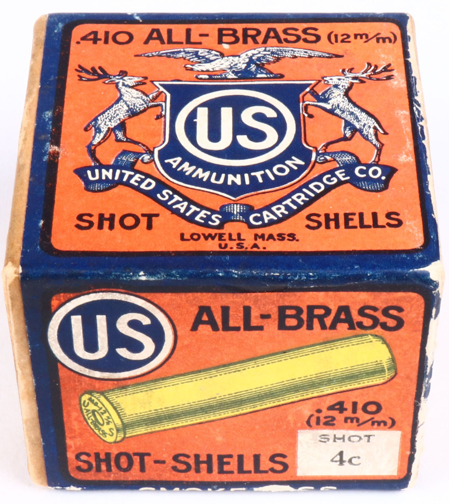 US Cart. Co., Lowell, Mass, 410ga, 2pc., ALL BRASS, Shot size 4C, FULL & SEALED, buff box, with orange, blue & white label, box has scuffing to bottom with great colors. Grade: Excellent + - Value: 100 to 500