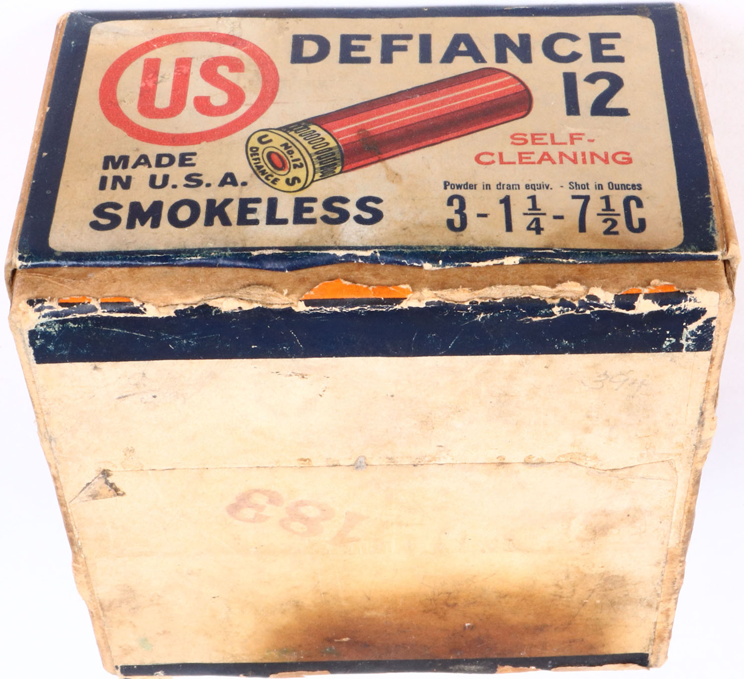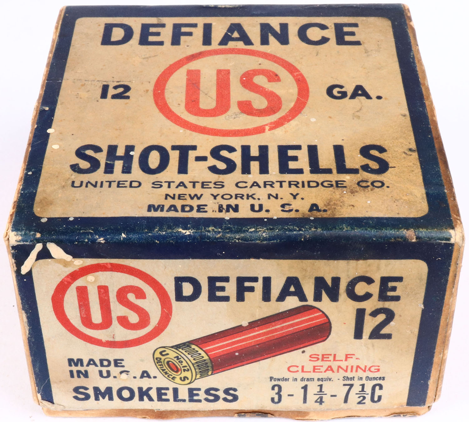 United States Cart. Co., New York, NY, DEFIANCE, 12ga., 2pc., Partial 22rds., shot size 7 1/2C, buff box with white, red & blue label, box has age soiling with nice label, shells are very good. Grade: Very Good ++ - Value: 20 to 100