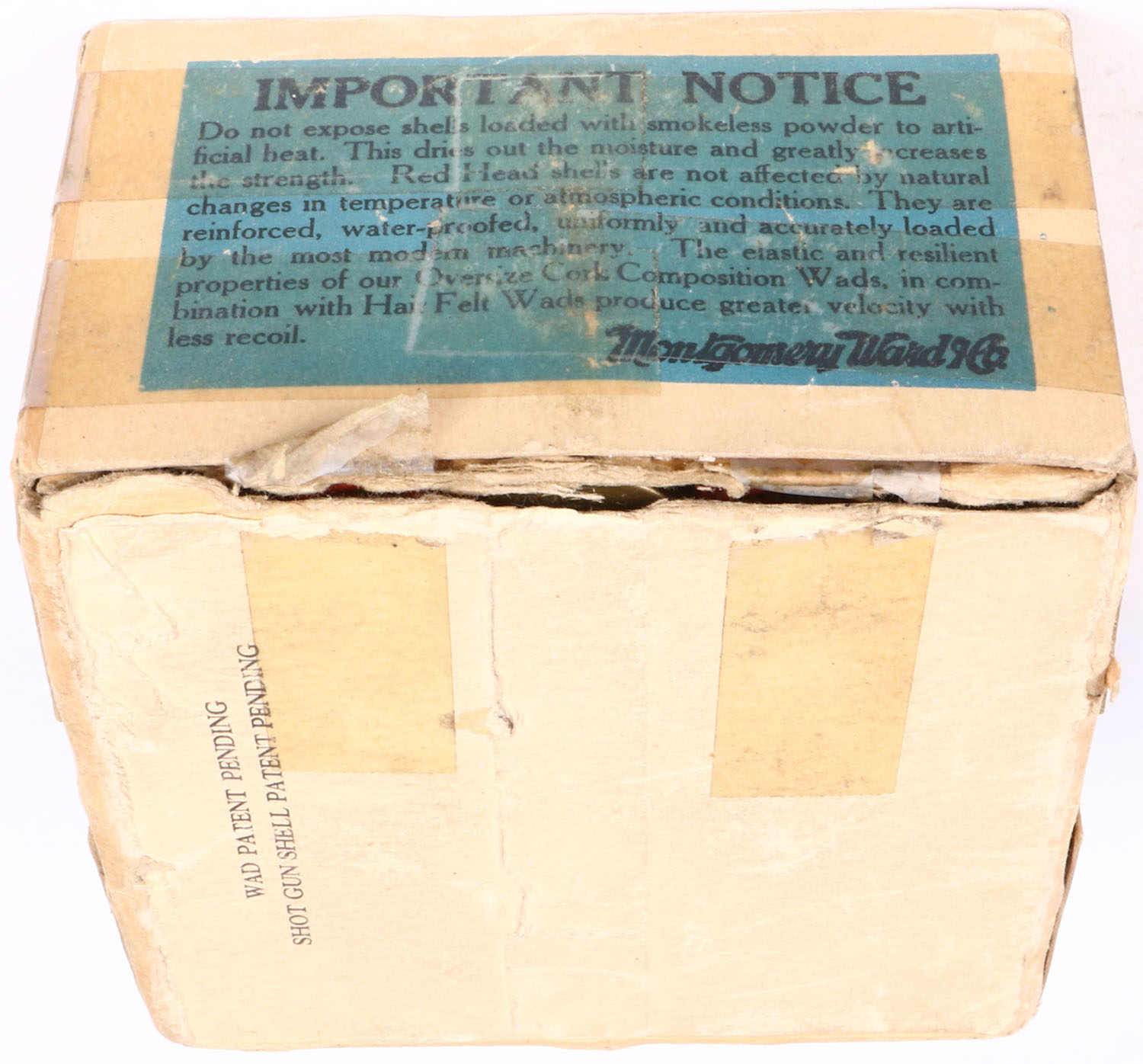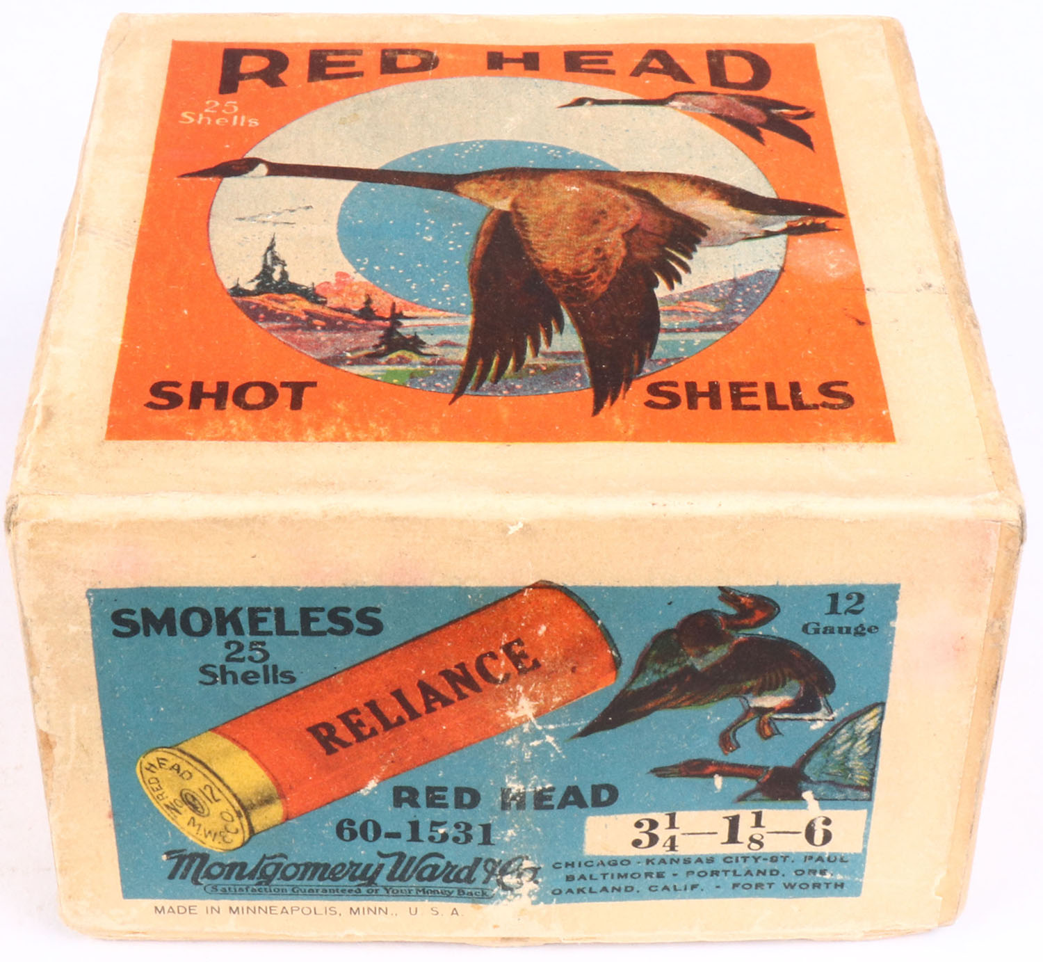 Montgomery Ward & Co., Red Head, Reliance, Has Early Side label, 12ga., 2pc., Partial 21rds., shot size 6, buff box with multi colored scene & two geese flying, box has seam splits, tape repair, light scuffing & light soiling with great colors, Shells are excellent. Grade: Very Good ++ - Value: 40 to 150