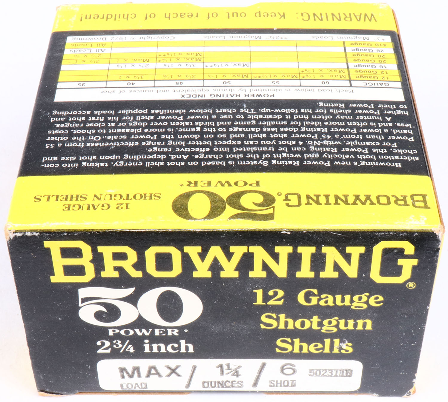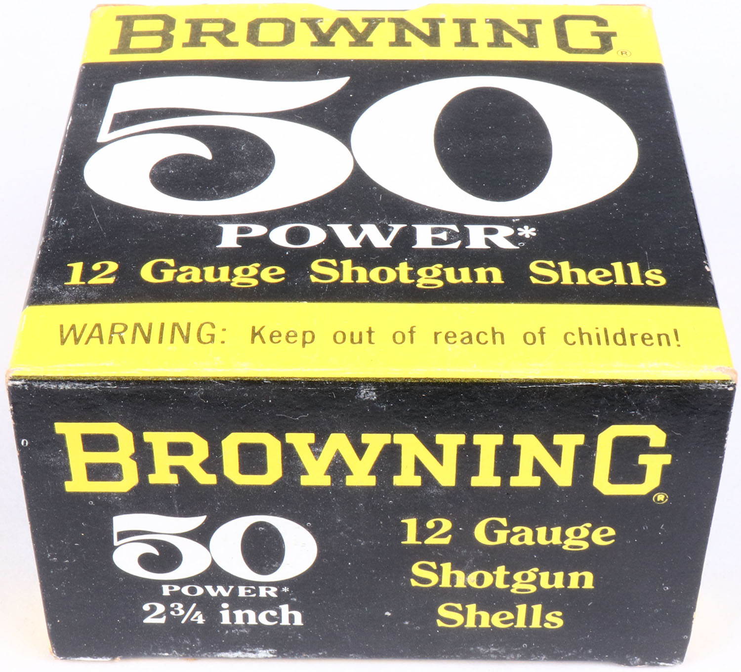 Browning, 50 Power, 12ga., 1pc., FULL, shot size 6, 2 3/4'', black, yellow & white box, box is solid with nice color, shells are excellent. Grade: Excellent ++ - Value: 20 to 60
