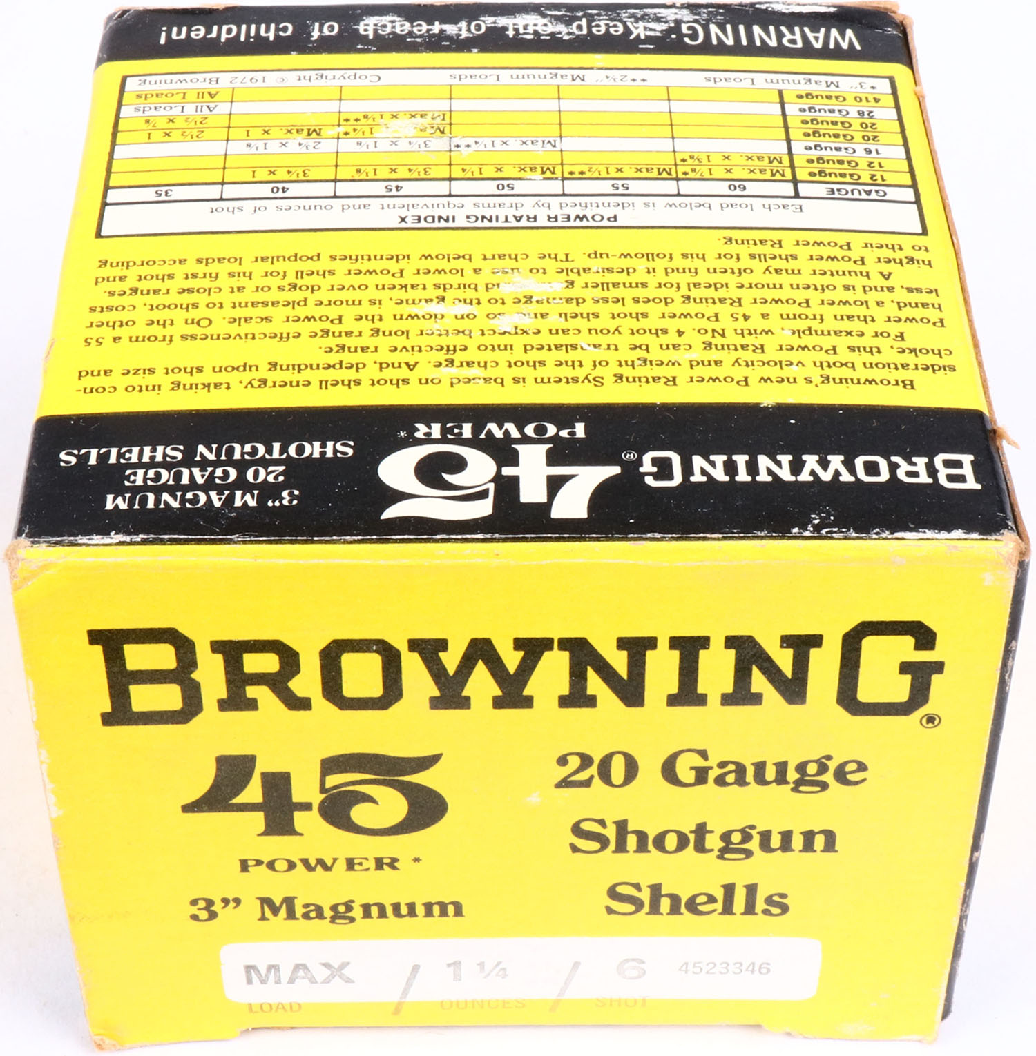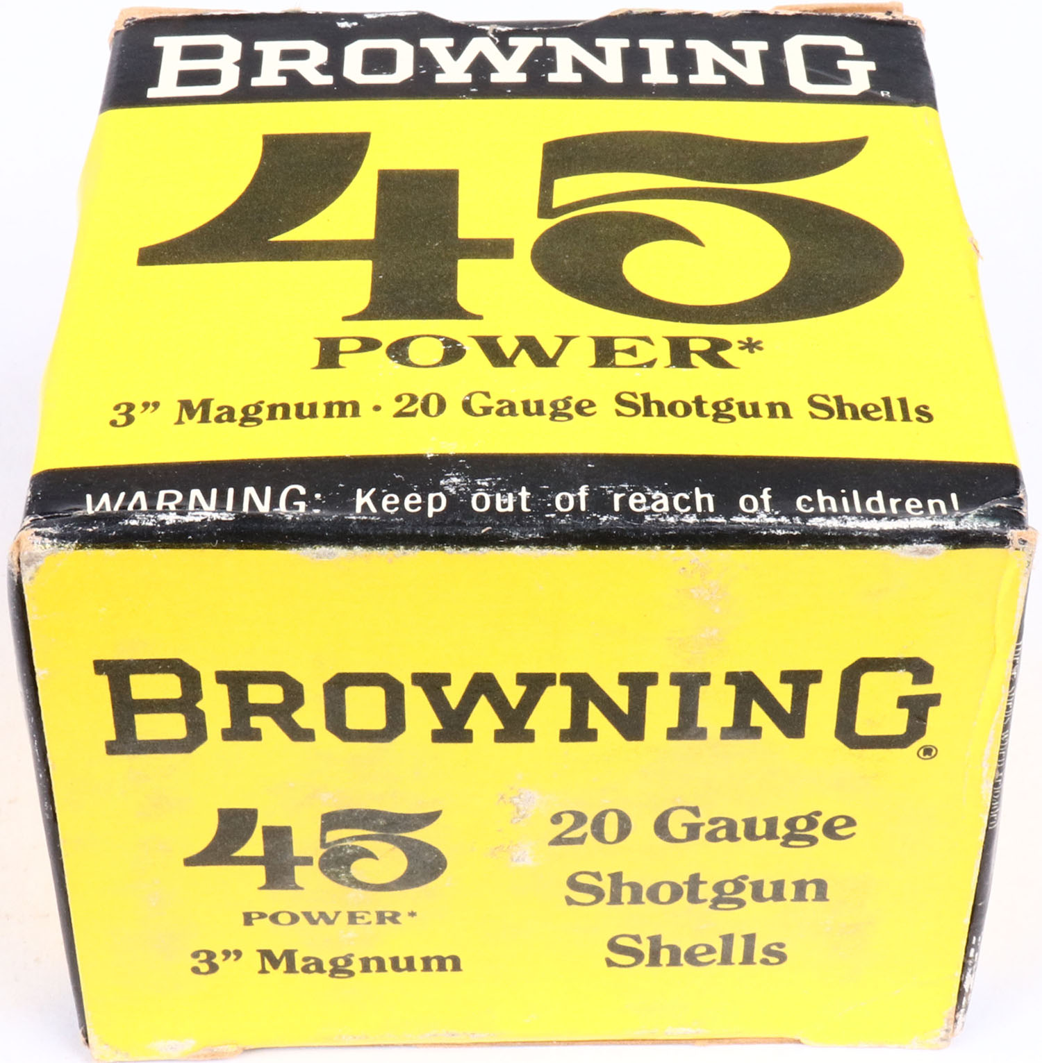 Browning, 45 Power, 20ga., 1pc., FULL, shot size 6, 3'' Magnum, black, yellow & white box, box is very solid with great color, shells are excellent. Grade: Excellent ++ - Value: 20 to 60
