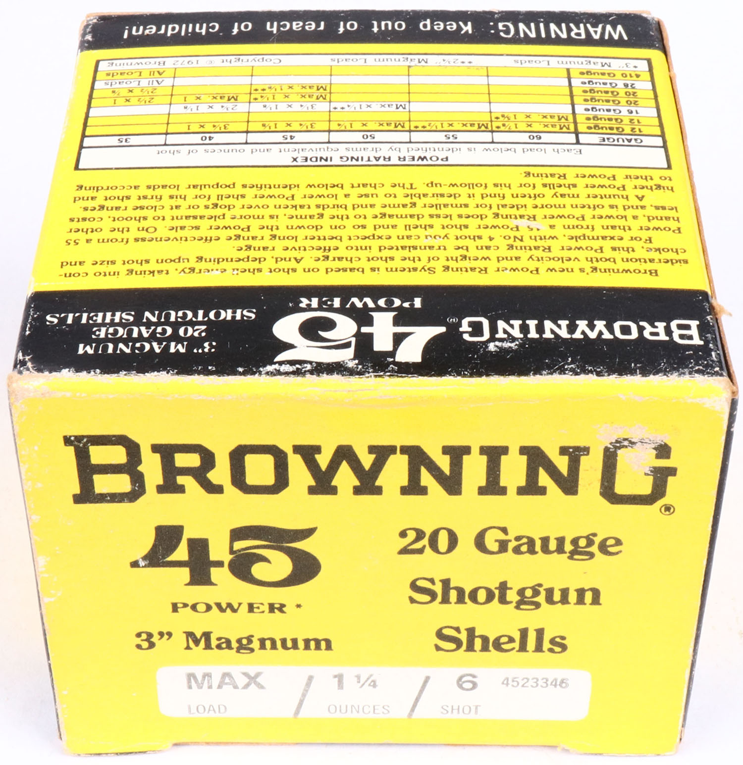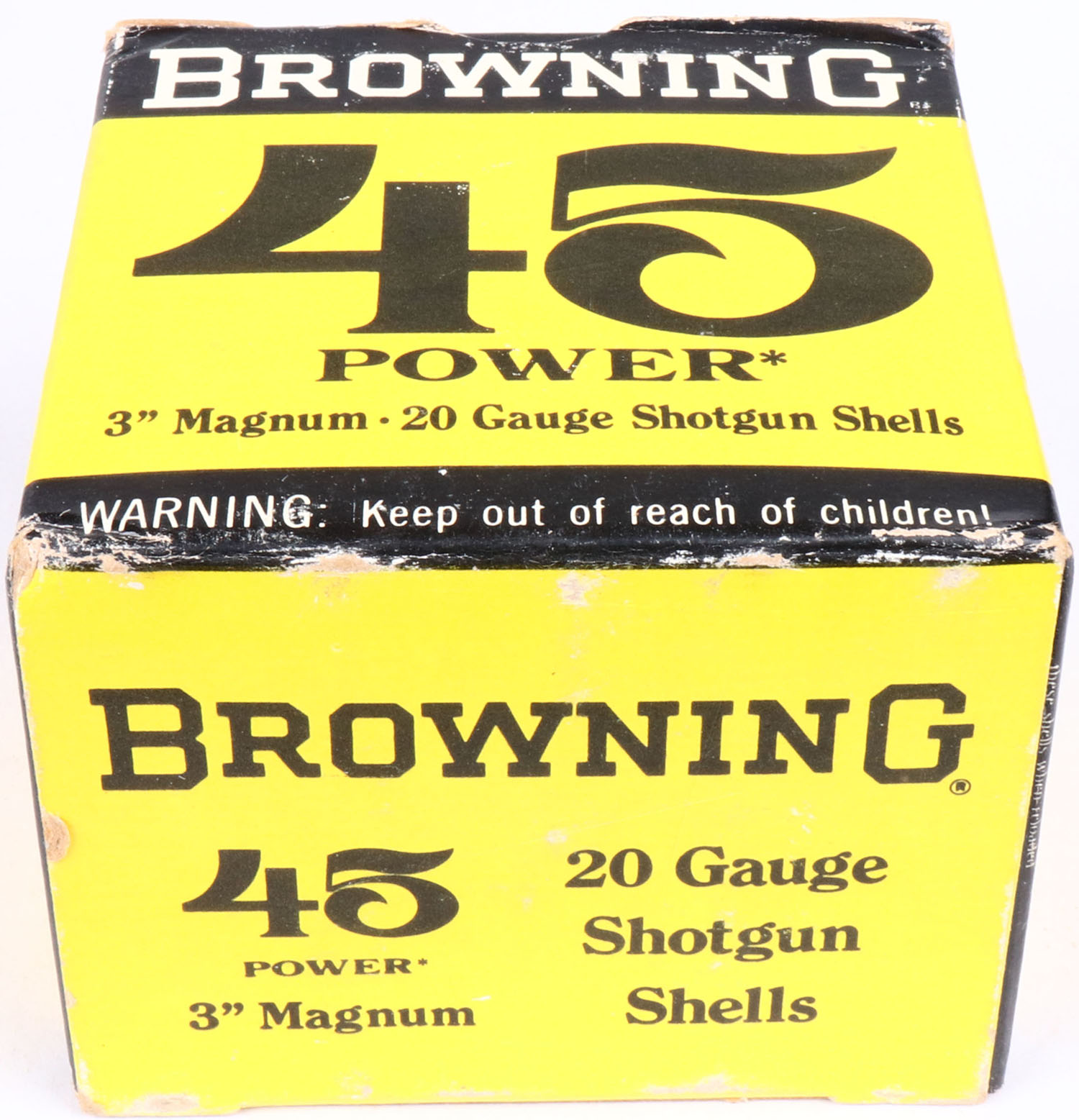 Browning, 45 Power, 20ga., 1pc., FULL, shot size 6, 3'' Magnum, black, yellow & white box, box is very solid with great color, shells are excellent. Grade: Excellent ++ - Value: 20 to 60