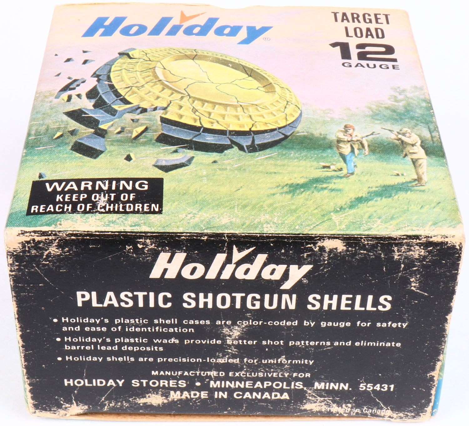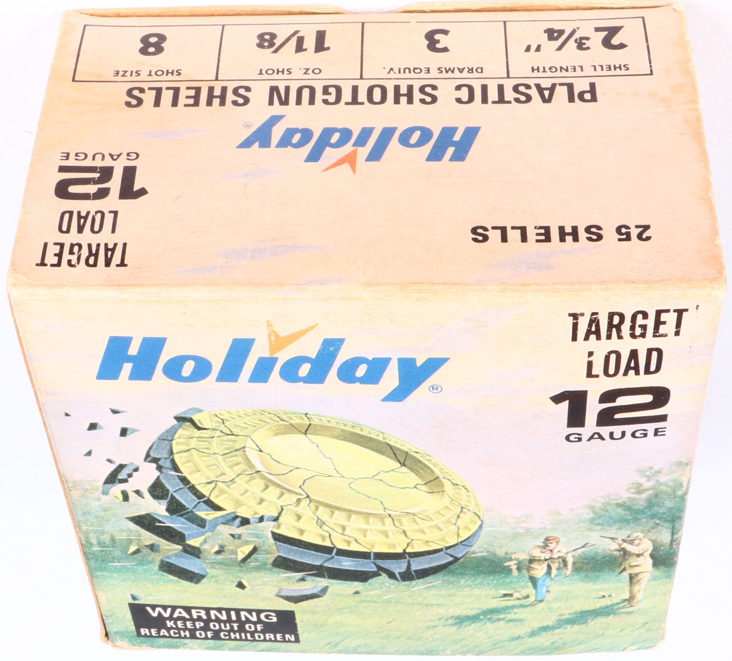 Holiday, Trap Scene, 12ga., 1pc., Empty, 2 3/4'', shot size 8, multi color graphics of trap shooting scene by Les Kouba, box is very solid with great colors & light scuffing. Grade: Excellent ++ - Value: 40 to 120