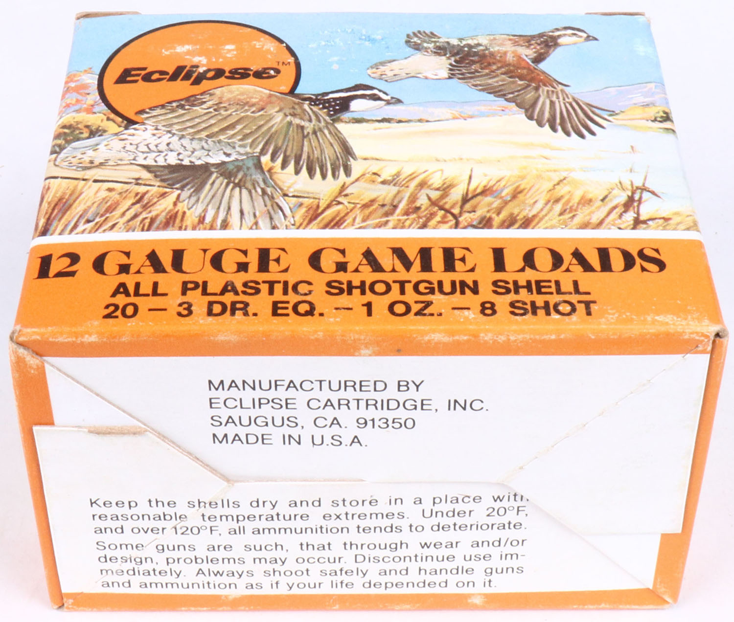 Eclipse, 12ga., 1pc., FULL, shot size 8, box is solid, Shells are excellent. Grade: Excellent + - Value: 8 to 20