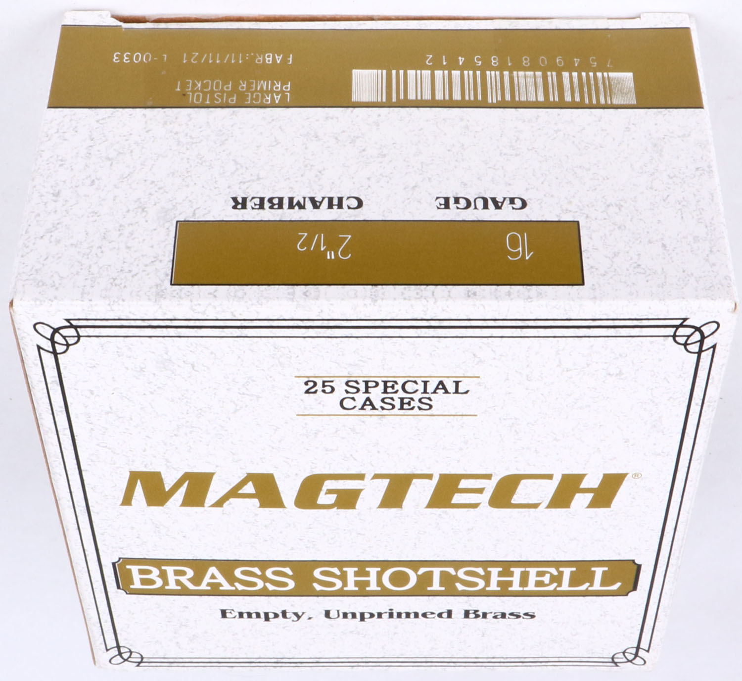 Magtech, 16ga., 1pc., Partial 20rds, shot size Empty Unprimed Brass, box is solid, Shells are excellent. Grade: Excellent + - Value: 10 to 30