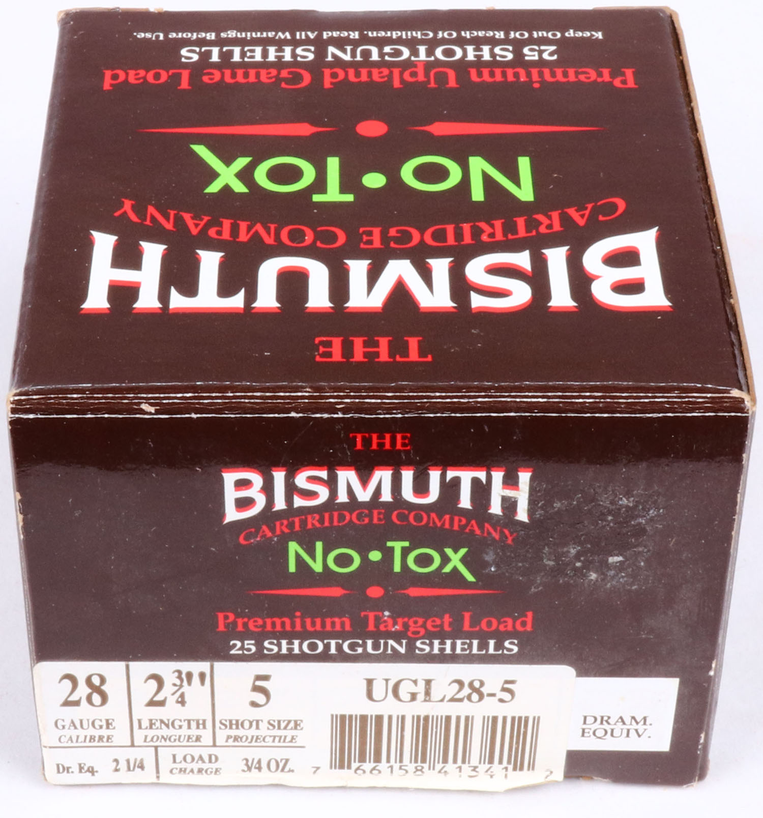 Bismuth, 28ga., 1pc., Full, shot size 6, box is solid, Shells are excellent. Grade: Excellent + - Value: 8 to 20