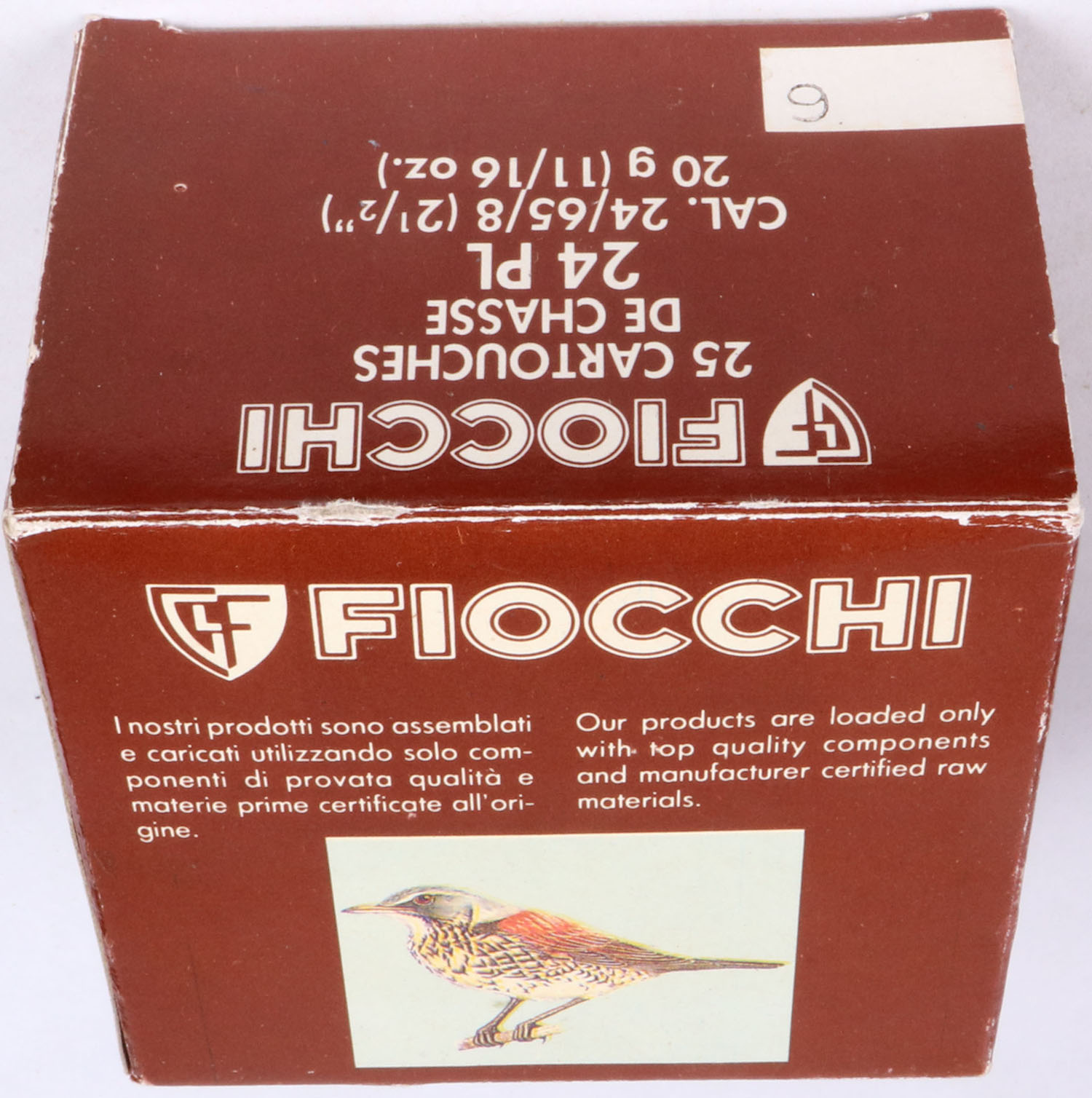 Fiocchi, 24PL., 1pc., Full, shot size 6, multi-colored box, box is very solid, Shells are excellent. Grade: Excellent + - Value: 8 to 20