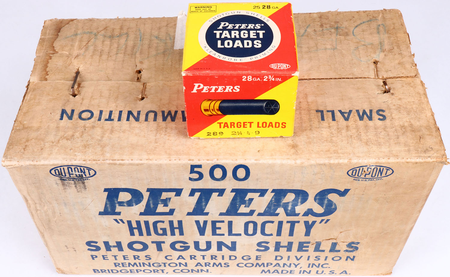 Peters, High Velocity, 28ga., 1pc., FULL case of 20 boxes, 500rds, shot size 9, box has torn top & age soiling, inside boxes are great, Shells are excellent. Grade: Excellent + - Value: 50 to 300