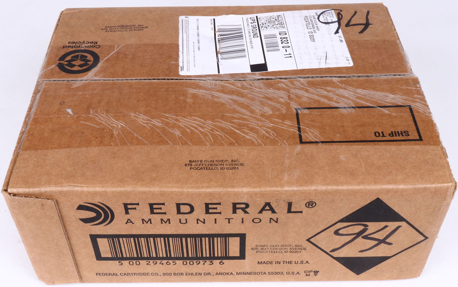 Federal, 12ga., 1pc., FULL & SEALED, 10 boxes, 250rds, shot size 00 Buck, case is solid. Grade: Excellent - Value: 50 to 300