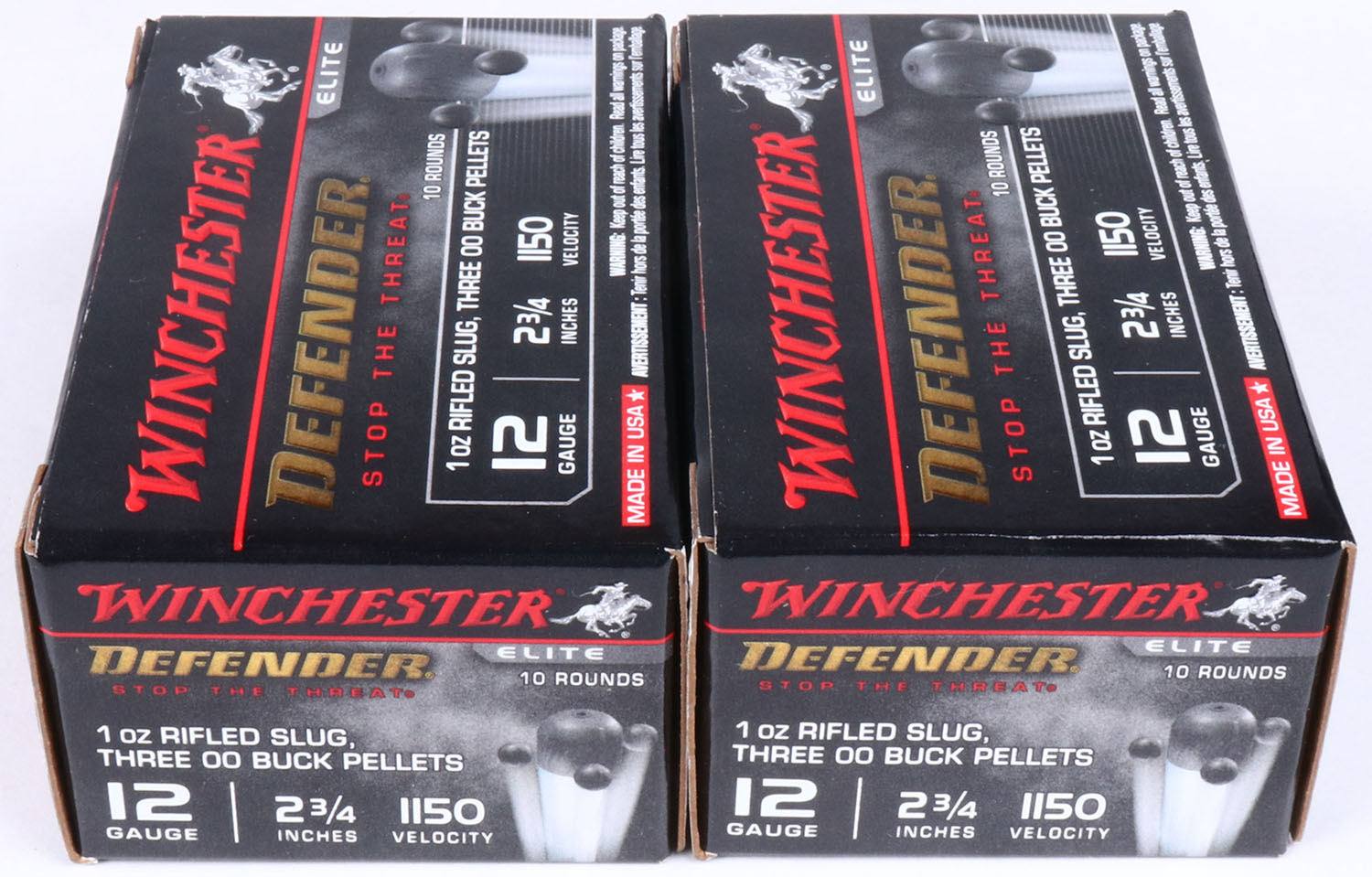 Lot of 2 Winchester, Defender, 12ga., 1pc., Full, 2 3/4'', shot size 1oz. Rifled Slug/three 00 Buck Pellets, multi-colored box, shells are very good. Grade: Excellent - Value: 8 to 20