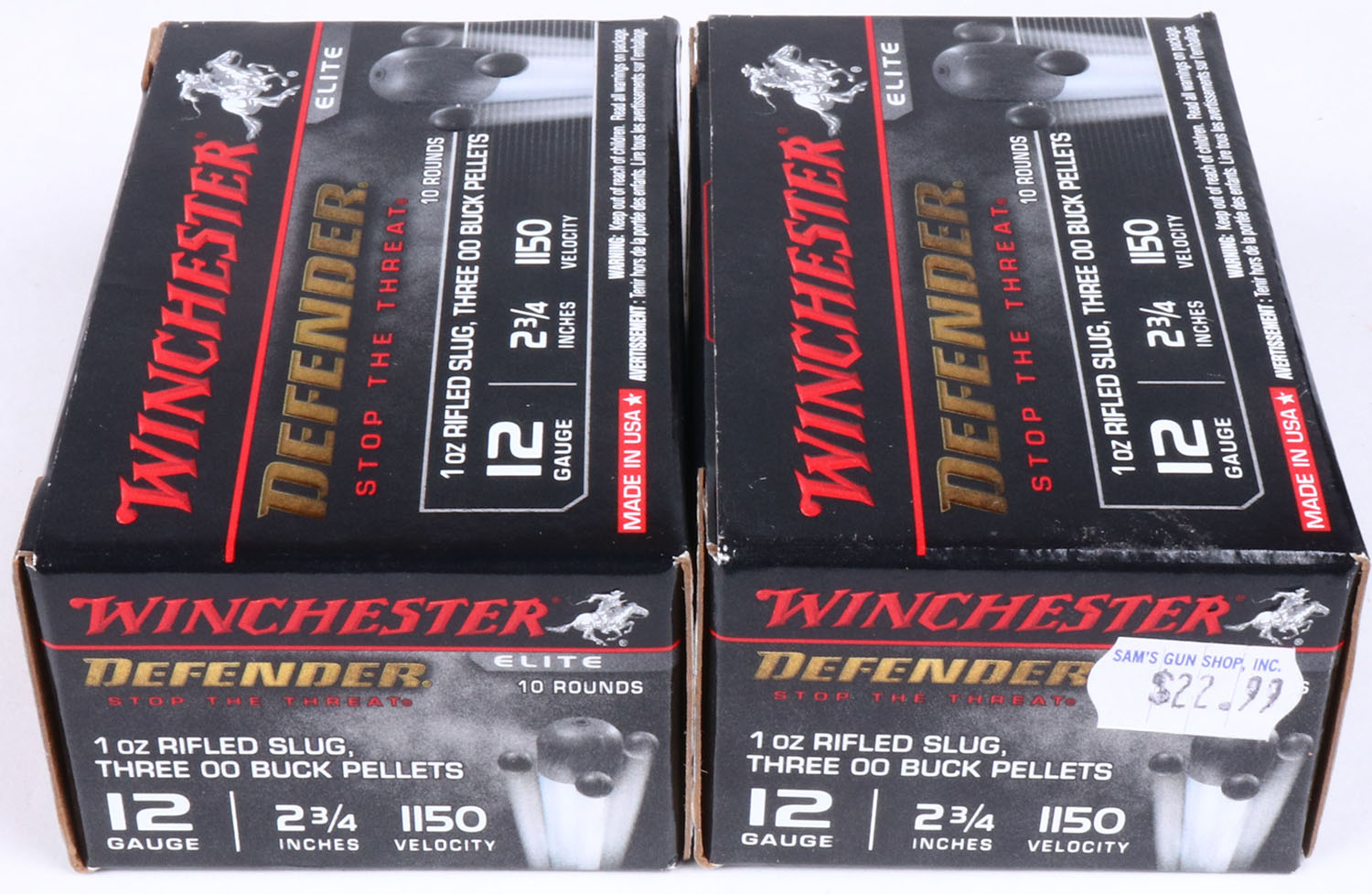 Lot of 2 Winchester, Defender, 12ga., 1pc., Full, 2 3/4'', shot size 1oz. Rifled Slug/three 00 Buck Pellets, multi-colored box, shells are very good. Grade: Excellent - Value: 8 to 20