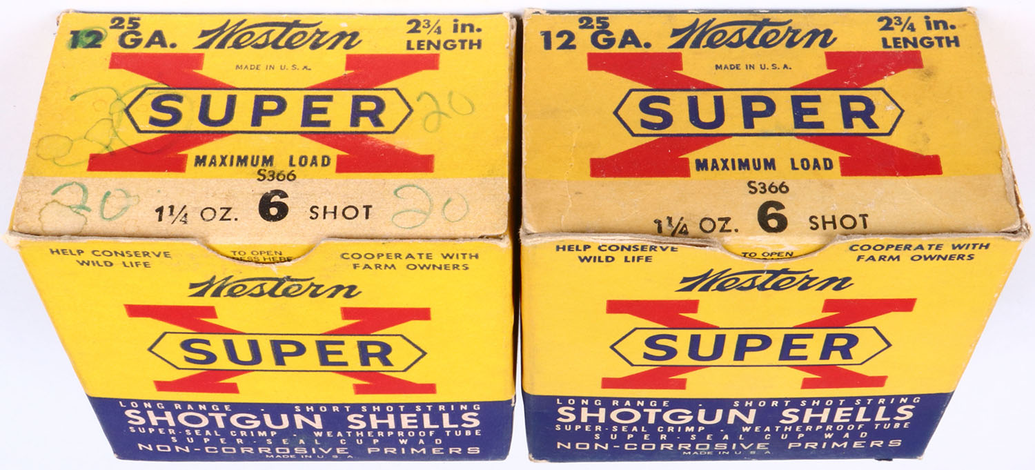 Lot of 2 Western, Super X, 12ga., 1pc., Partial, 2 3/4'', shot size 6, multi-colored box, shells are very good. Grade: Excellent - Value: 8 to 20