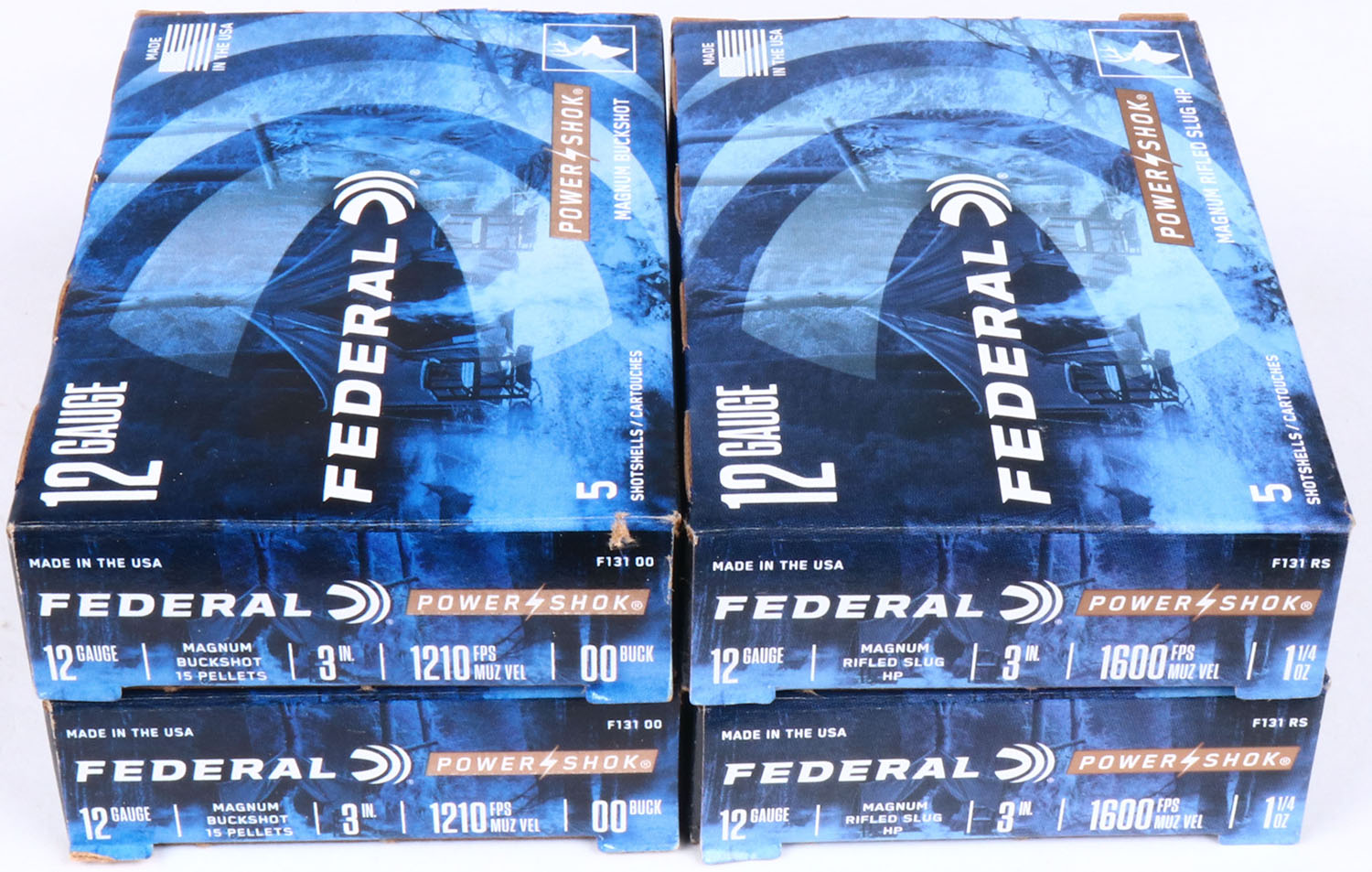 Lot of 4 Federal, 12ga., 1pc., Full, 3'', shot size Magnum Rifled Slug & 00 Buck, multi-colored box, shells are very good. Grade: Excellent - Value: 8 to 20
