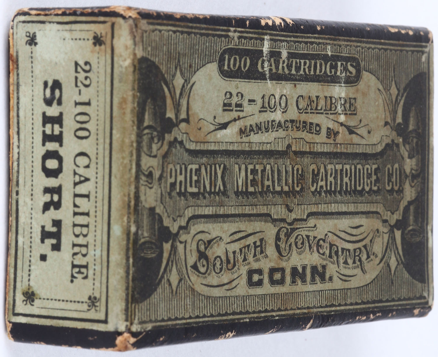 Phoenix Metallic Cartridge Co., .22-100 Calibre, .22 Short, RHWeb: PMC-1 S-1, Partial 3rds., 2pc. Black box with green wraparound label, box is solid with very good to excellent color, some age soiling to label, minor edge & corner wear, label is intact, ammo is very good. Grade: Excellent - Value: 40 to 120